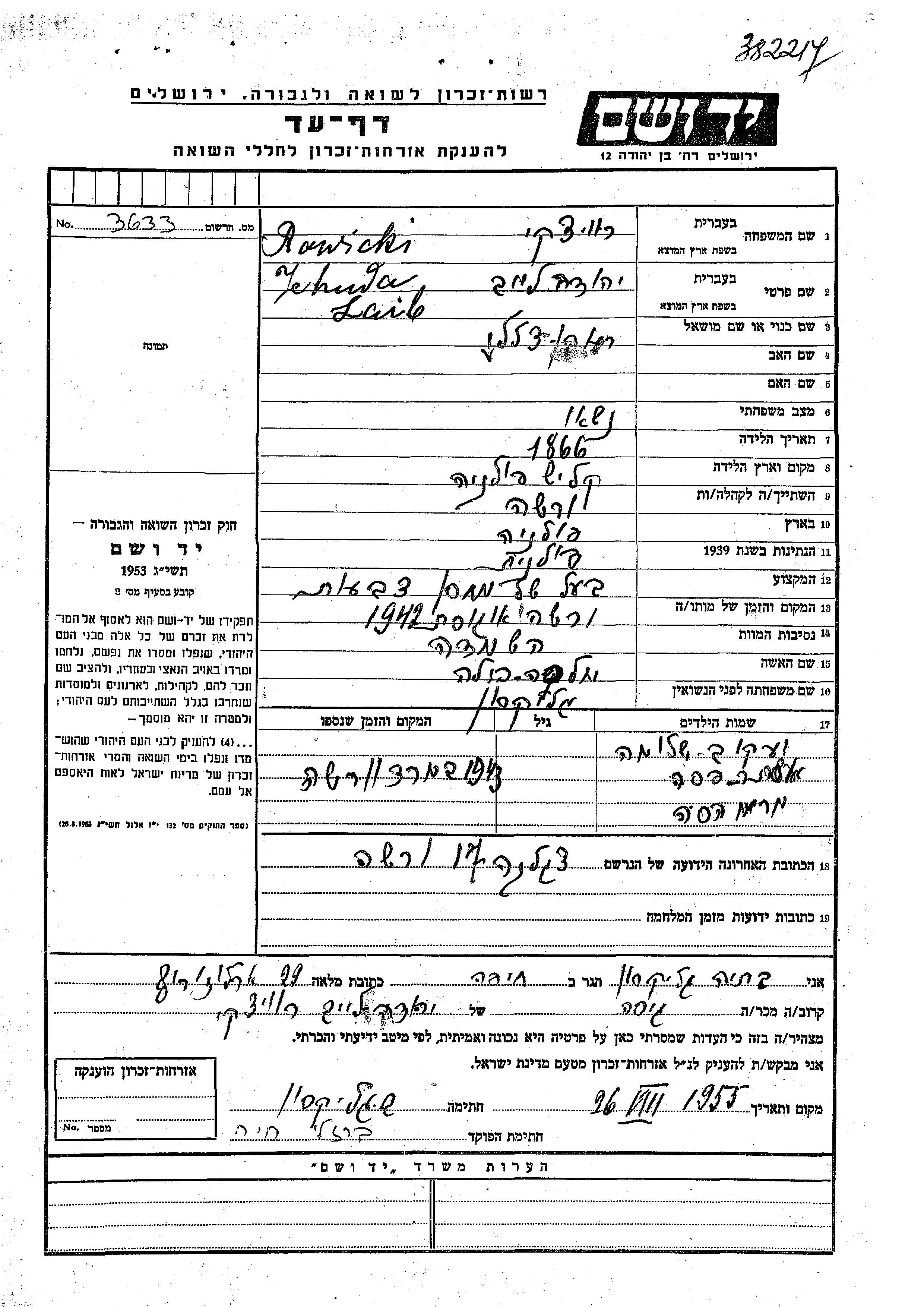 Rawicki Yehuda Leib 1866 endroit inconnu, Feuille de témoignage