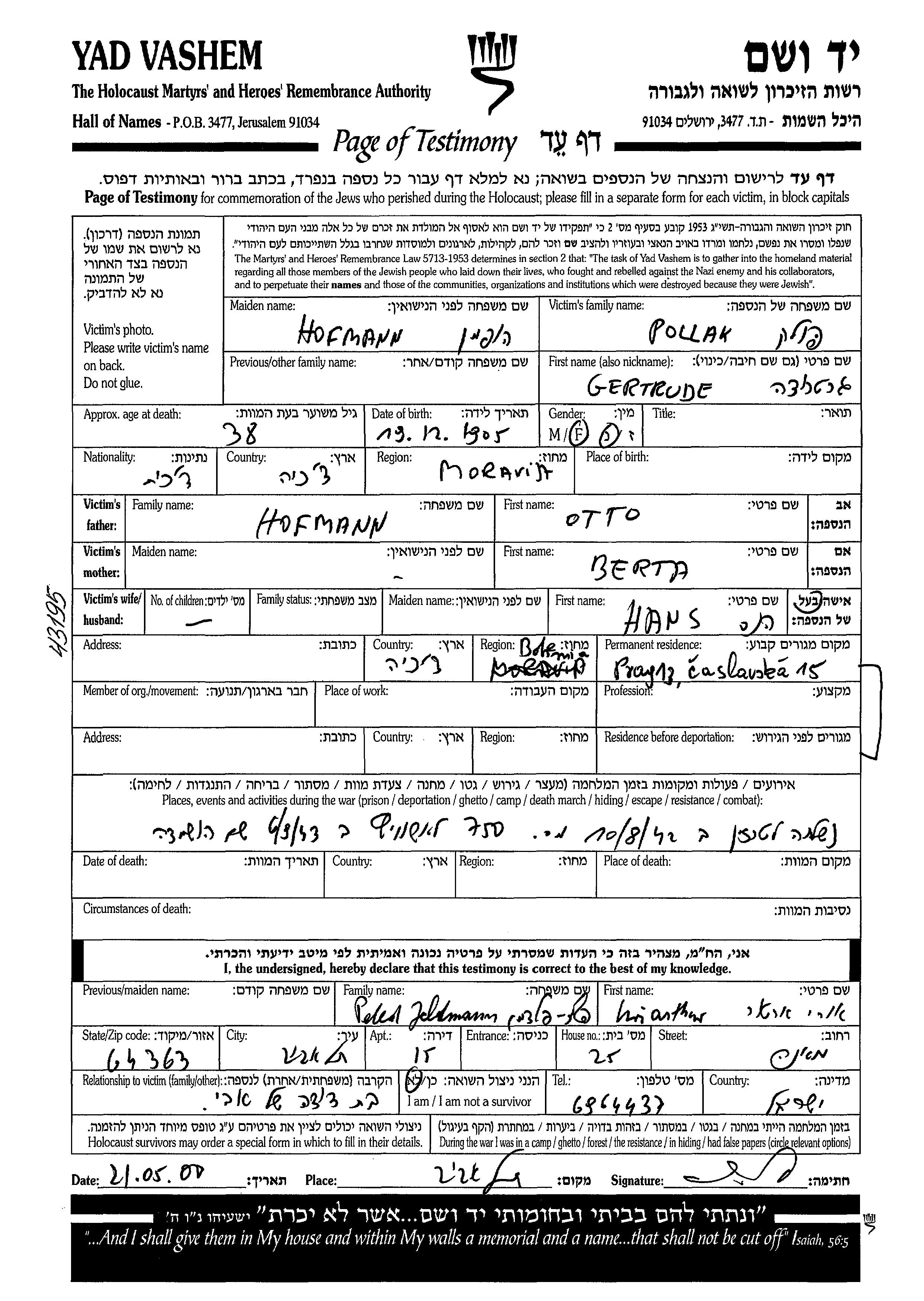 Pollak | Gertrude | 1905 | Prag, Tchécoslovaquie | Feuille de témoignage |
