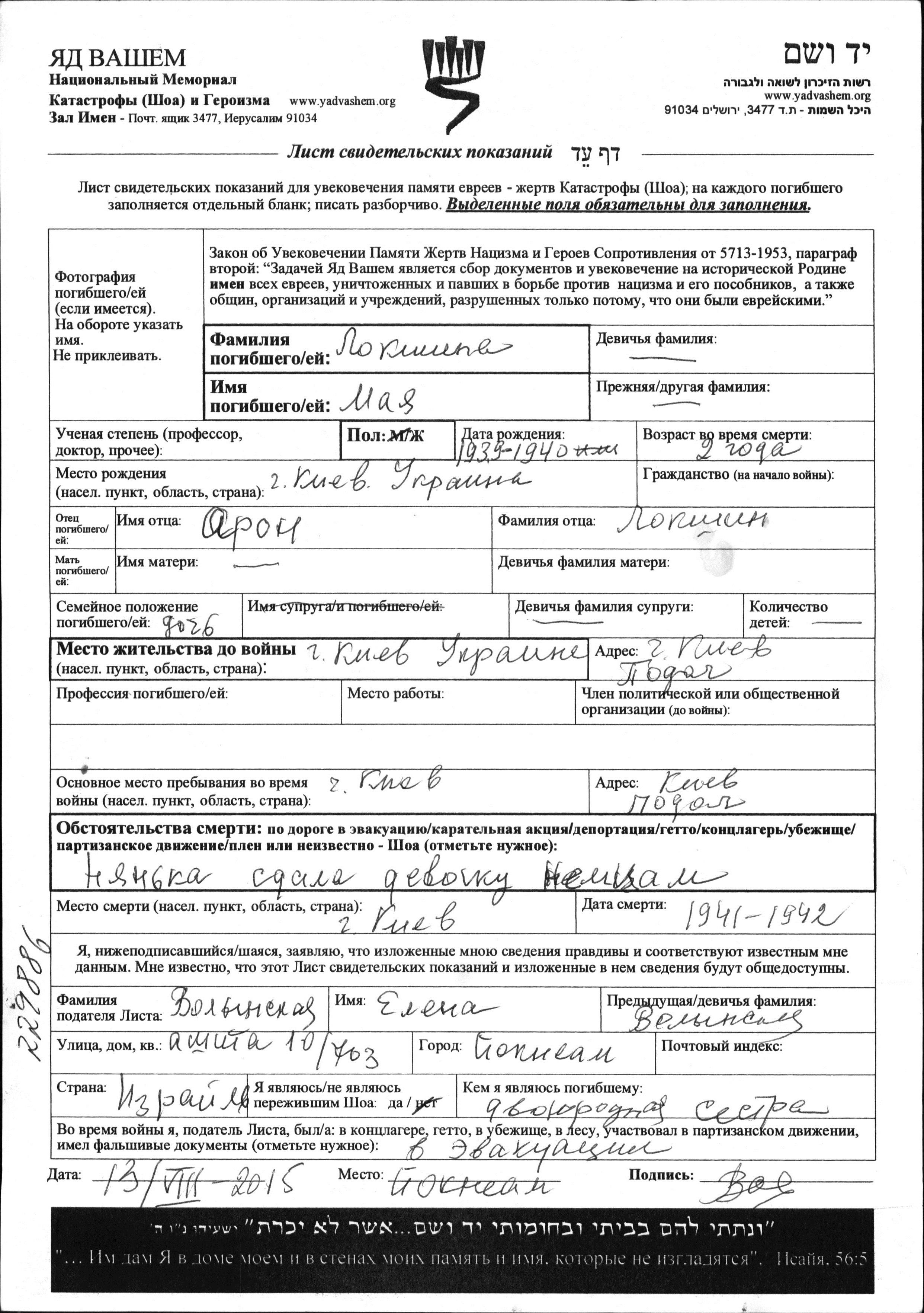 Lokshina Maya 1939 Kiev, Ukraine (URSS) Feuille de témoignage
