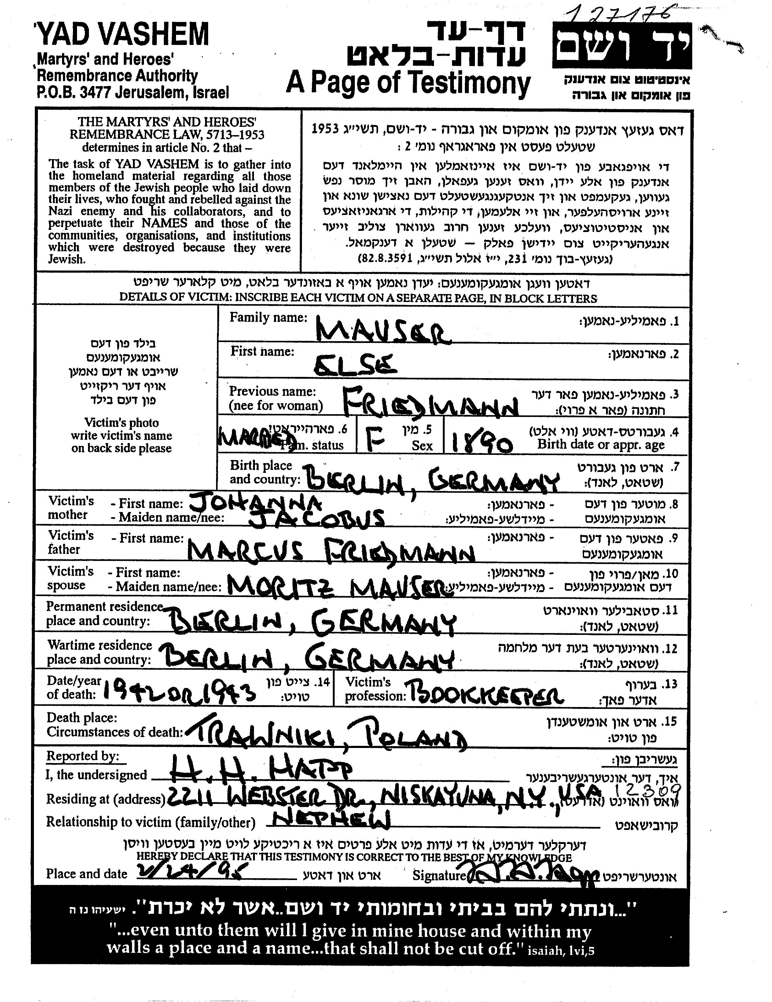 Mauser | Else | 1890 | Berlin, Allemagne | Feuille de témoignage |