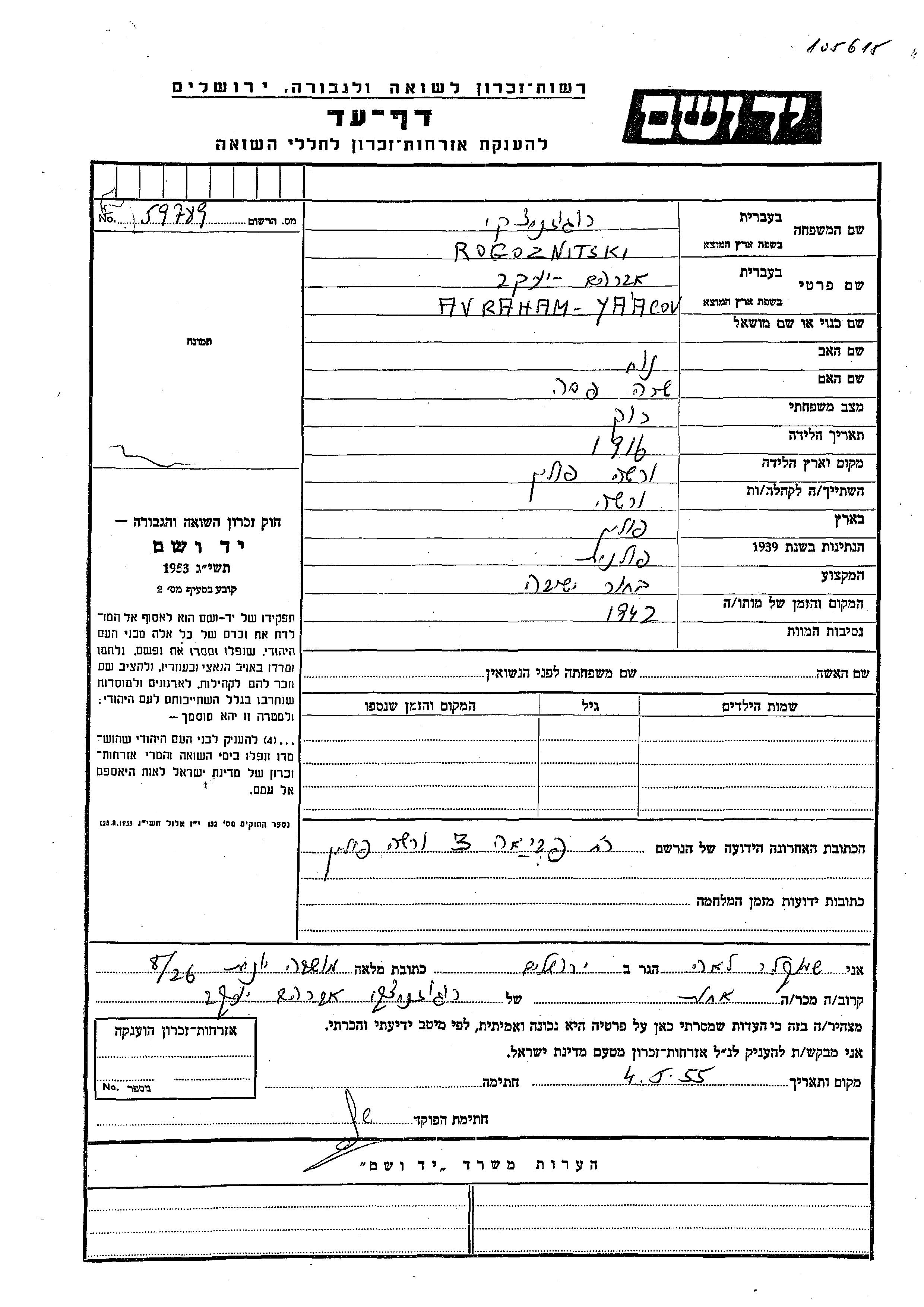 Rogoznitski Yaacov Avraham 1916 endroit inconnu, Feuille de témoignage