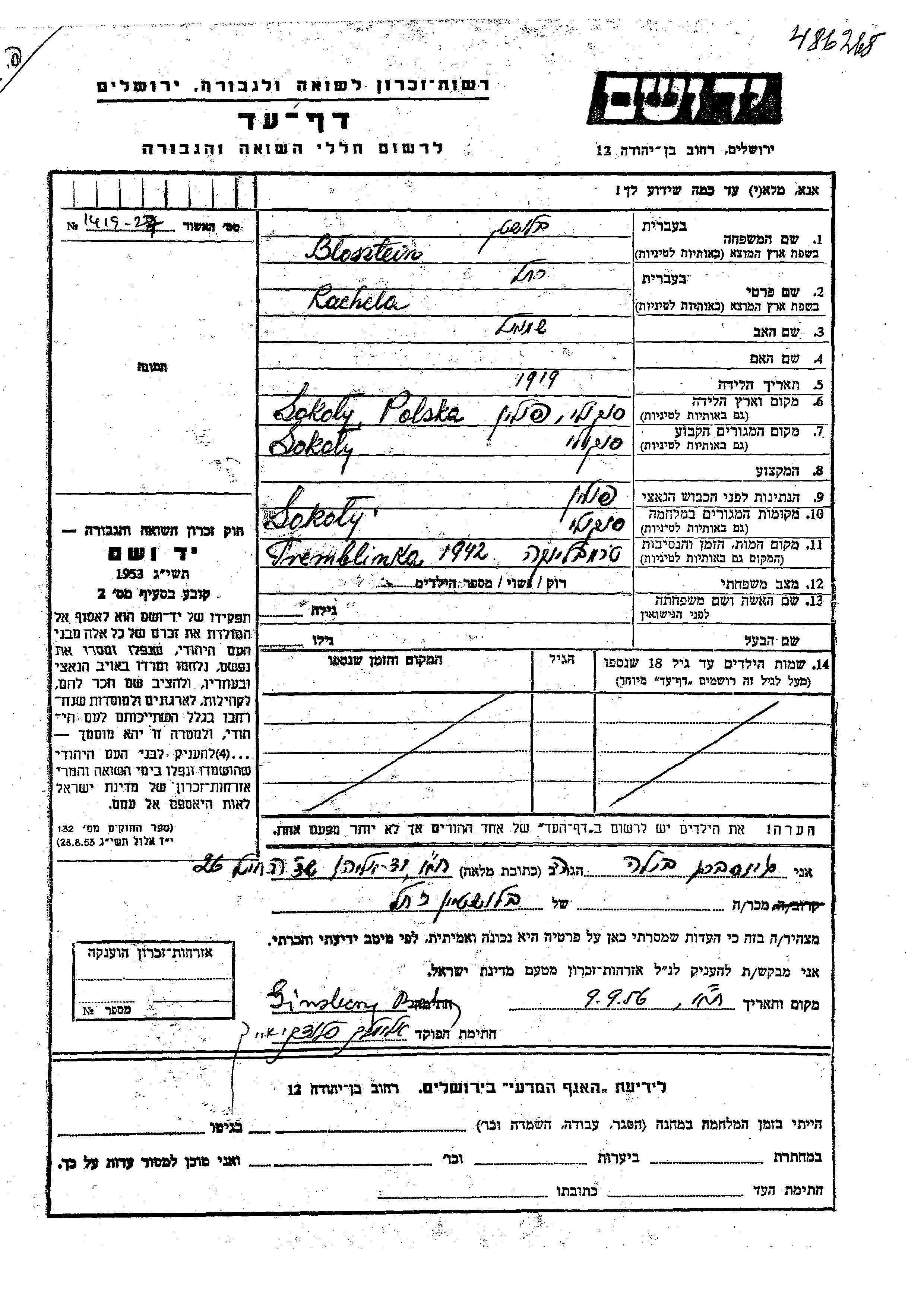 Blosztein Rachela 1919 Sokoly, Pologne Feuille de témoignage