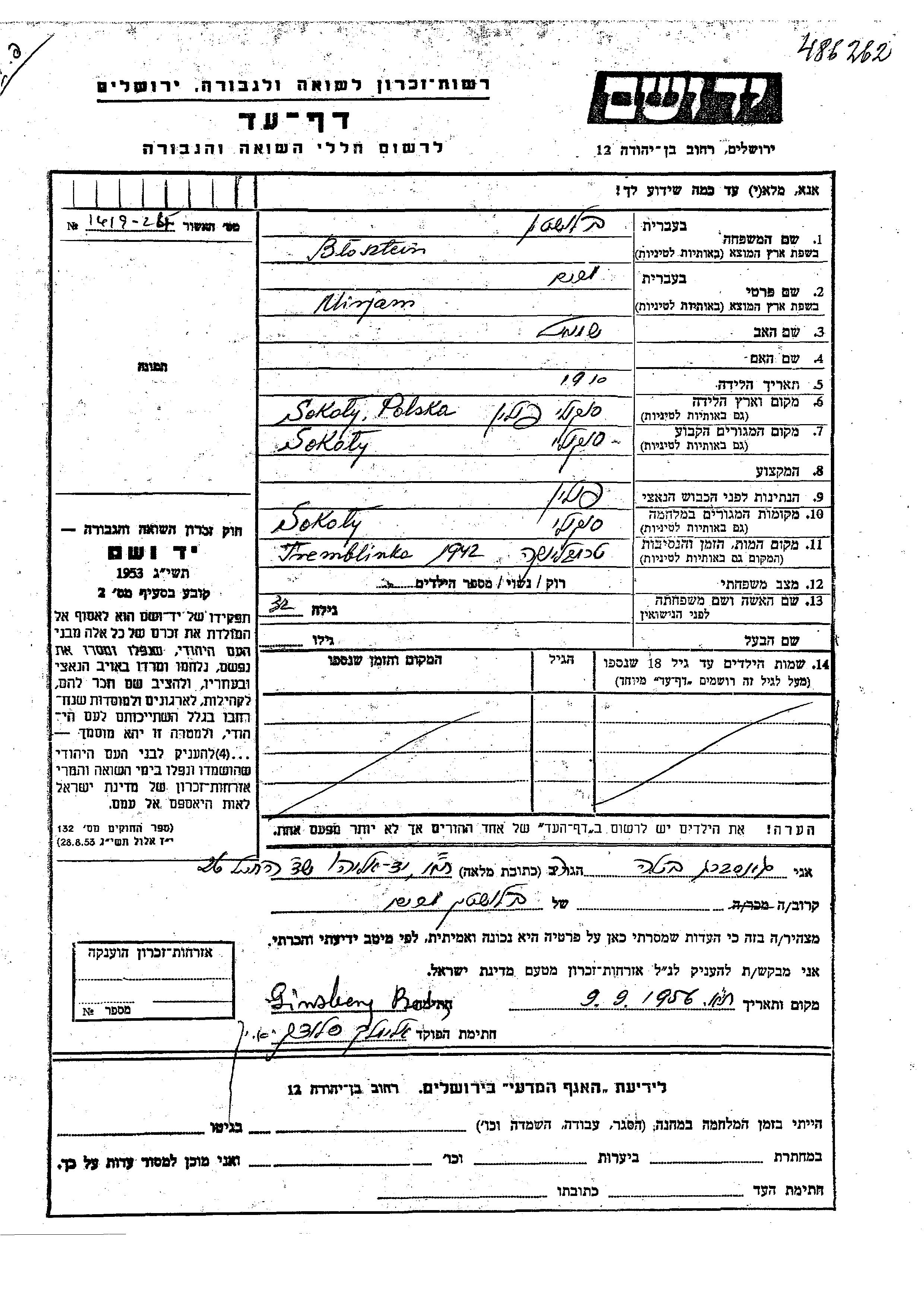 Blostein Mirjam 1910 Sokoly, Pologne Feuille de témoignage