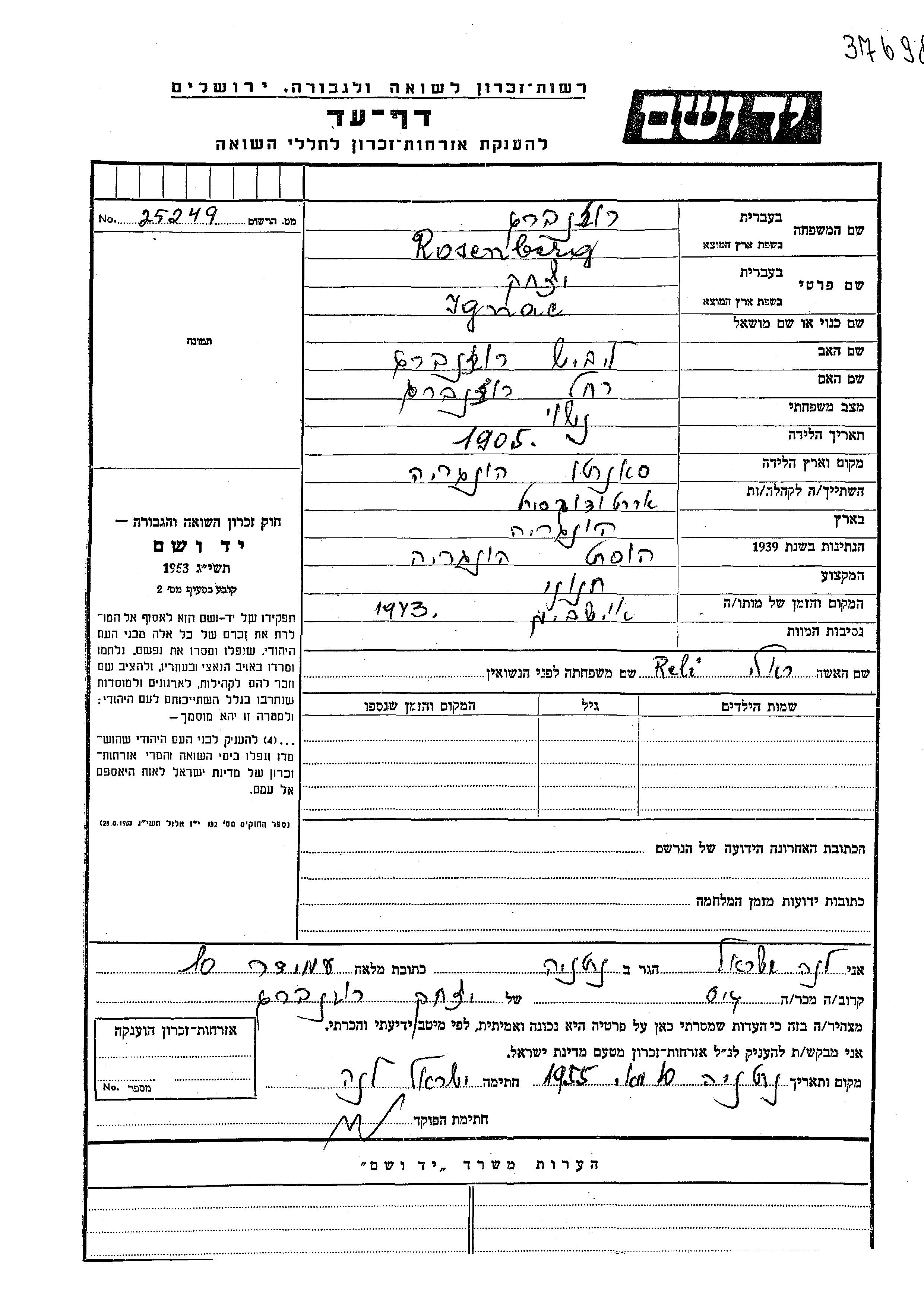 Rozenberg Jgnac Yitzkhak 1905 endroit inconnu, Feuille de témoignage
