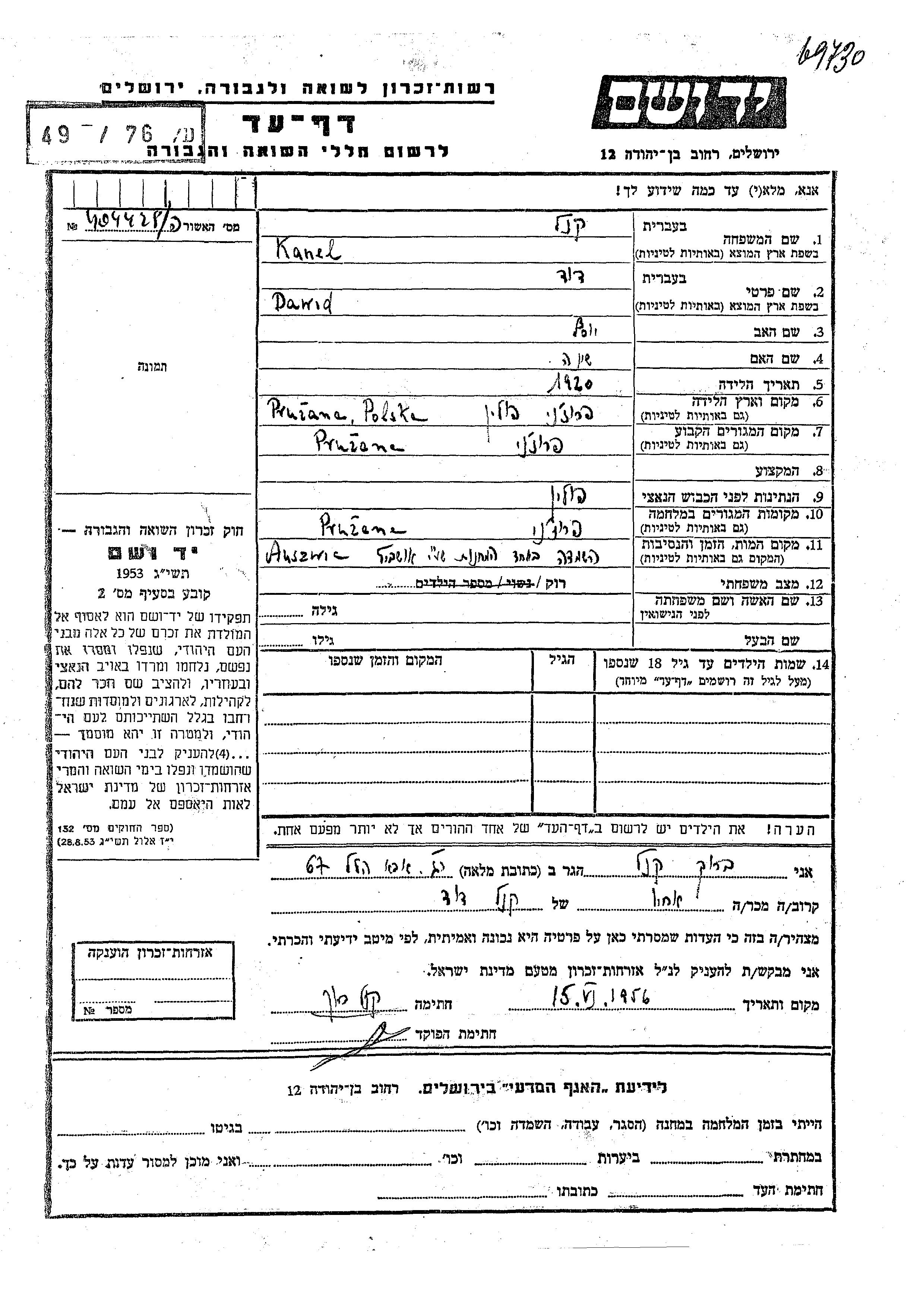 Kanel Dawid 1920 Pruzana, Pologne Feuille de témoignage