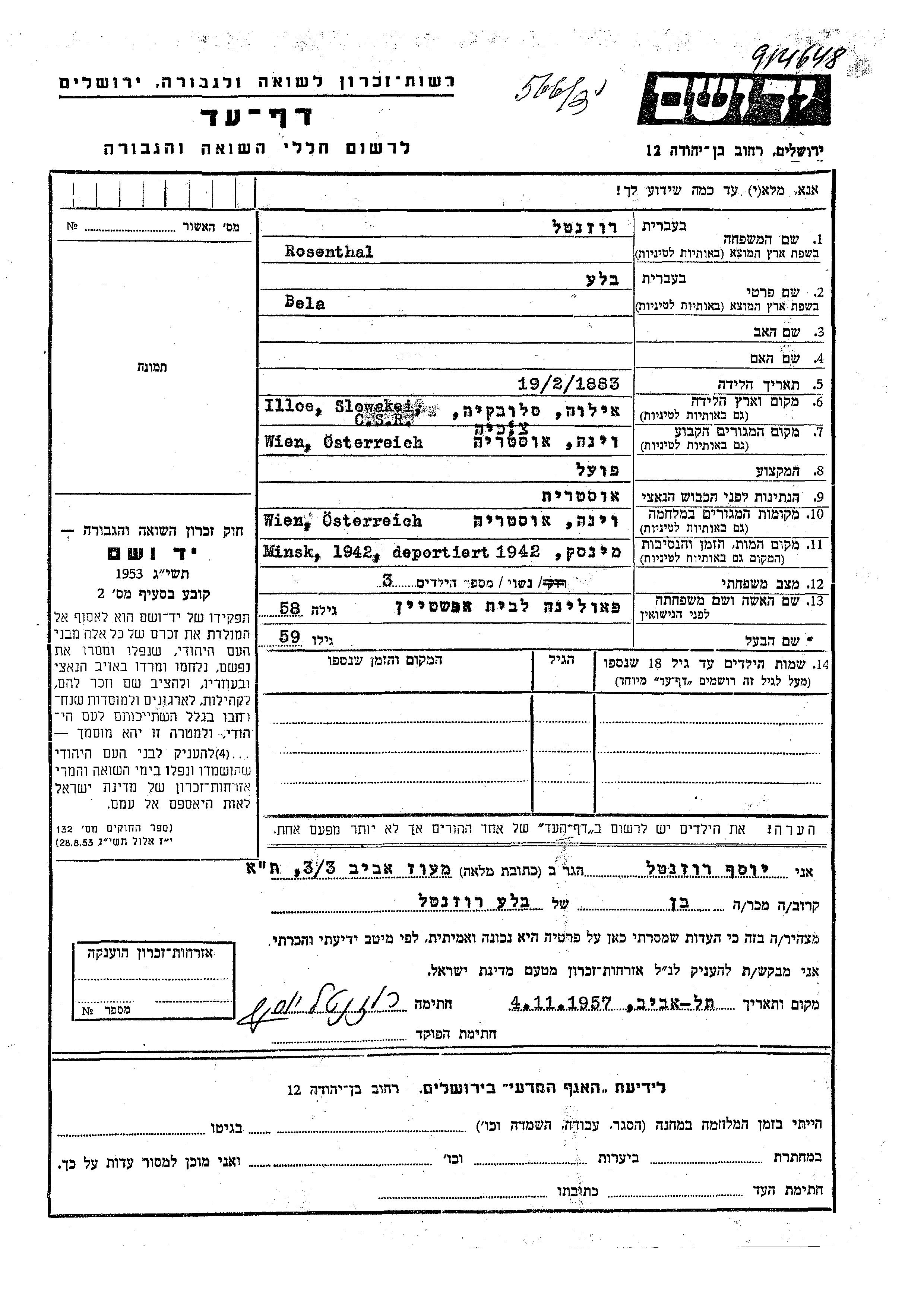 Rosenthal Bela 1883 Wien, Autriche Feuille de témoignage