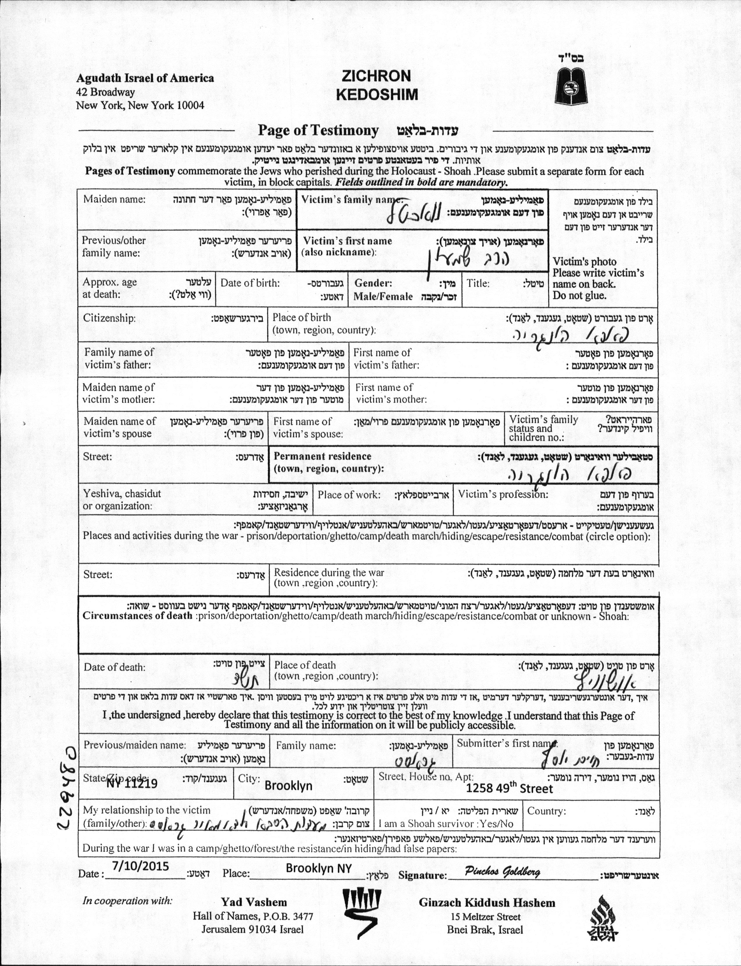 Yad Vashem - Pages of Testimony Names Memorial Collection
