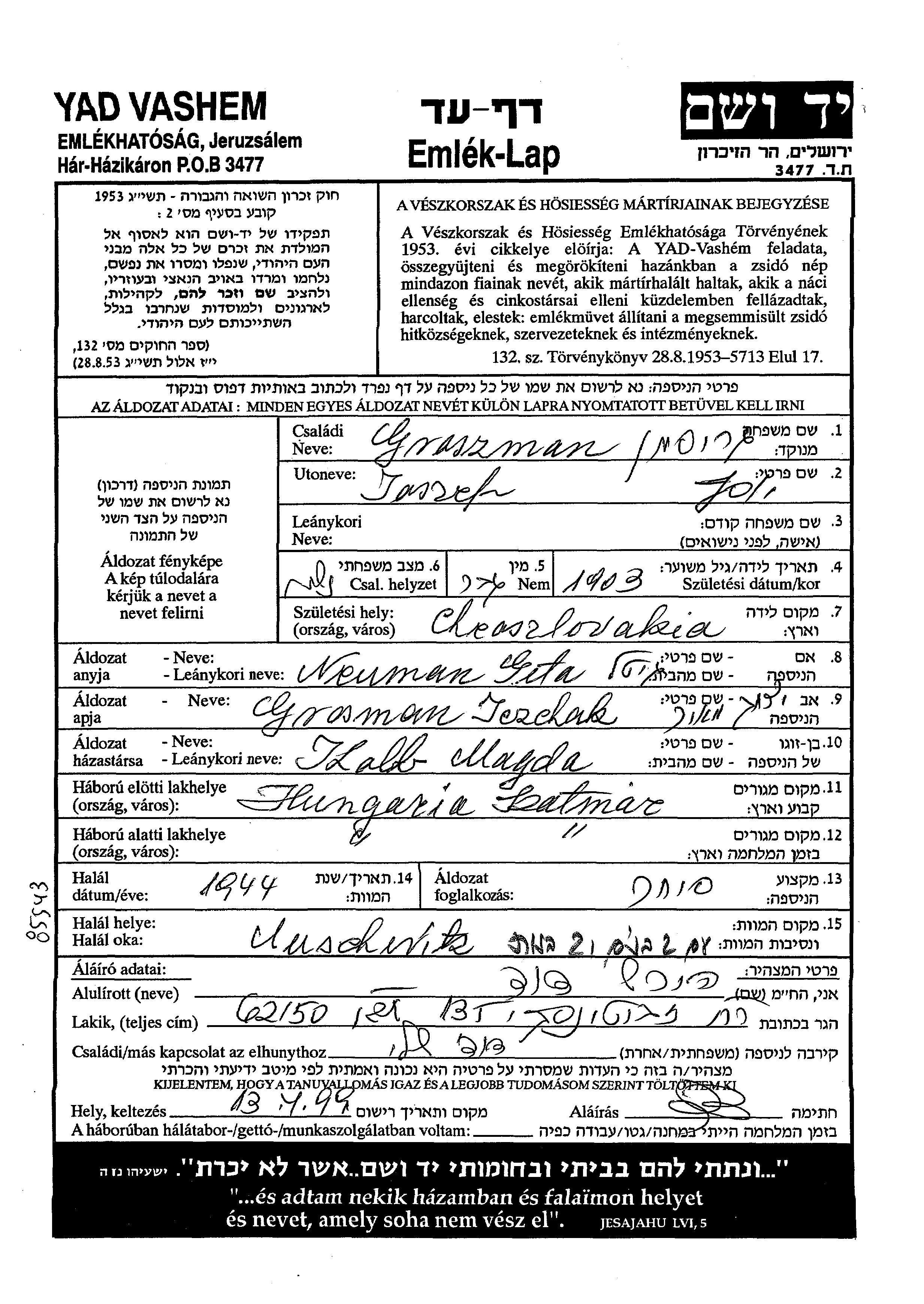 Groszman Joszef 1903 Szatmarnemeti, Roumanie Feuille de témoignage