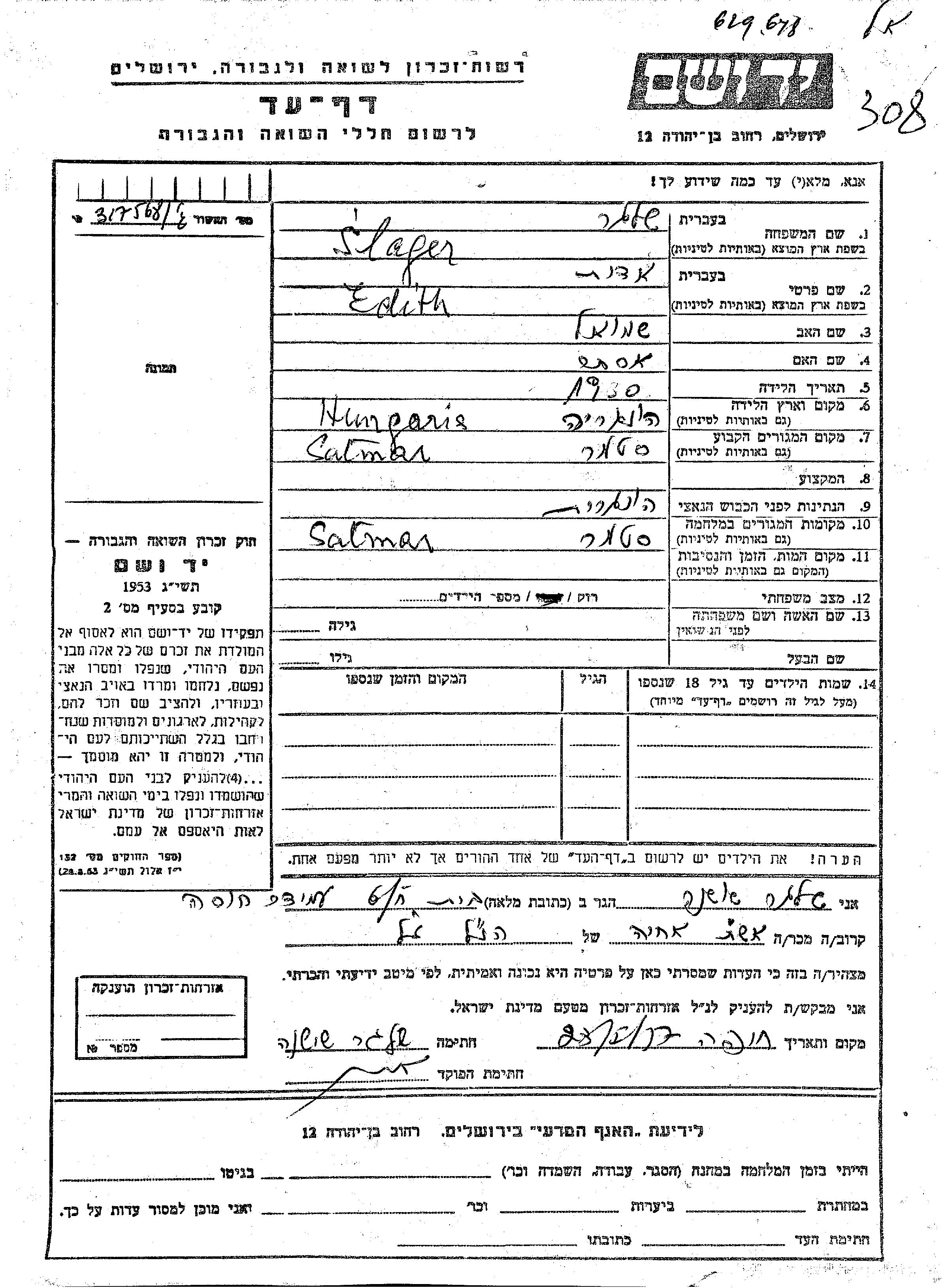 Slager | Edith | 1930 | Satmar, Roumanie | Feuille de témoignage |