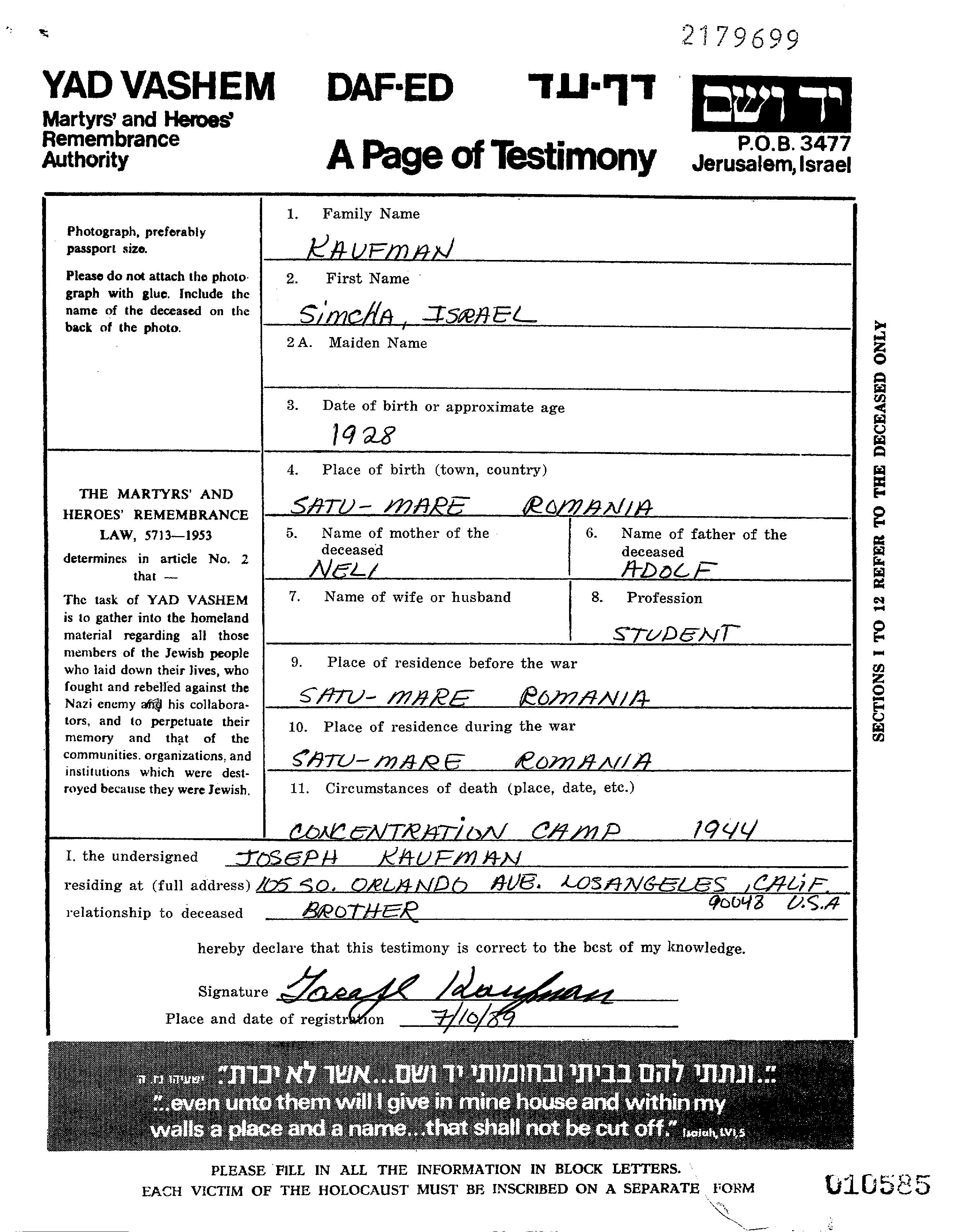 Kaufman Simcha Srool Zoltan 1927 Szatmar, Roumanie Feuille de témoignage