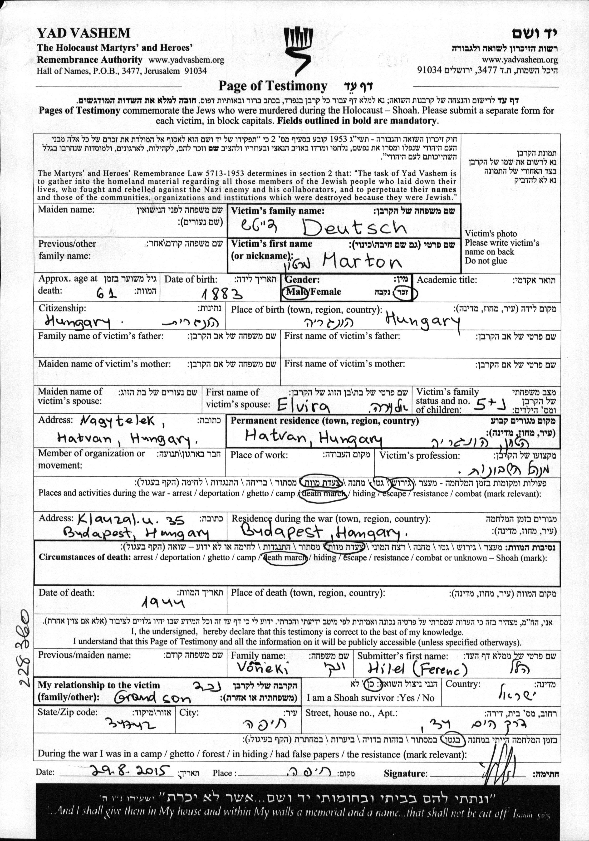 Márton Deutsch est né à Hongrie en 1883. Il était Comptable. Avant la seconde guerre mondiale il vivait à Hatvan, Hongrie.