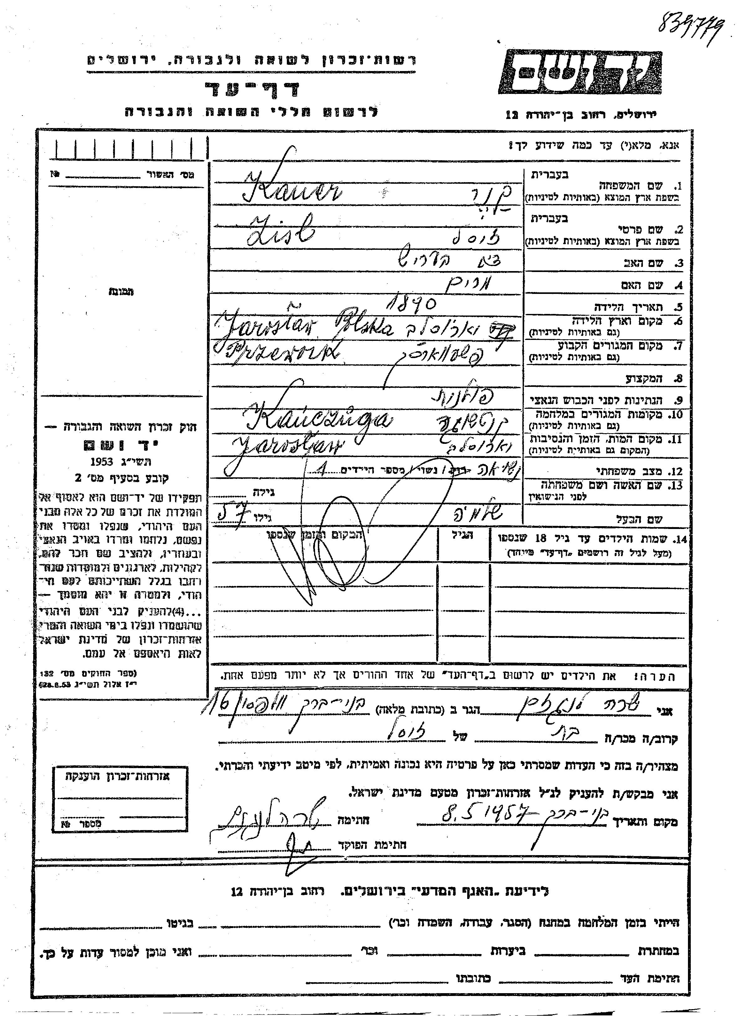 Kaner Zisl 1890 endroit inconnu, Feuille de témoignage