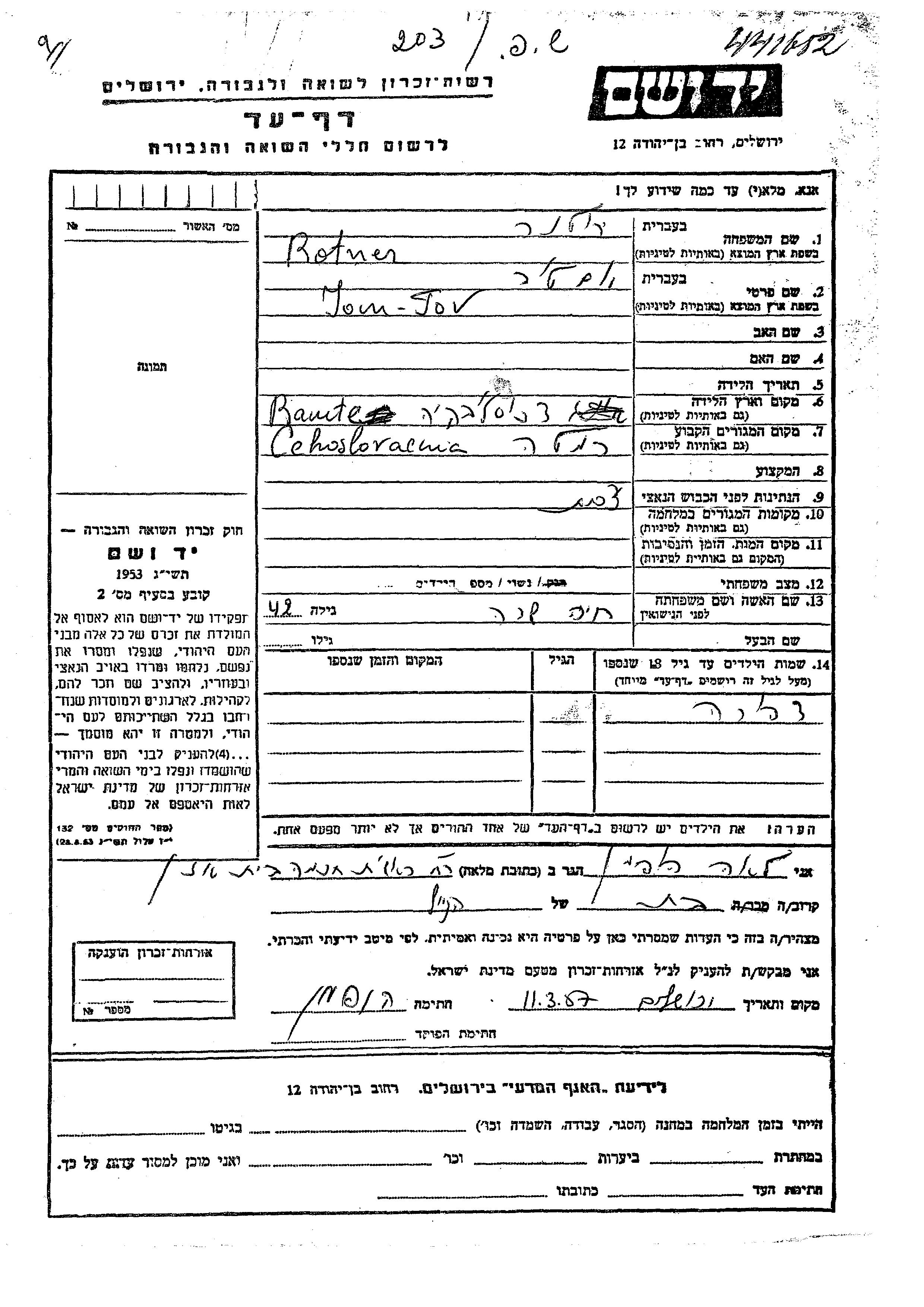 Rotner Yom Tov Ramte, Tchécoslovaquie Feuille de témoignage