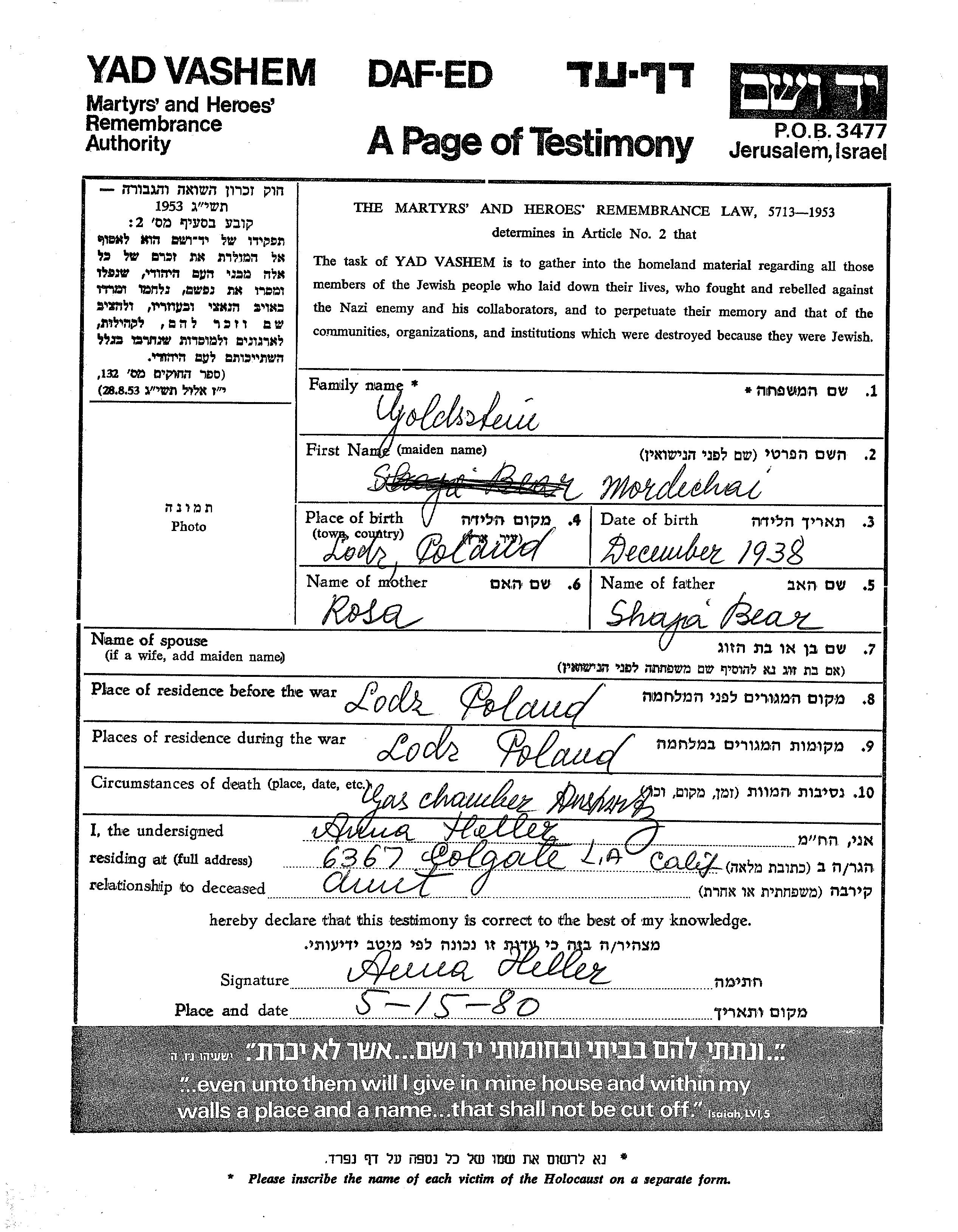 Mordechai a été assassiné pendant la Shoah. Lieu de la mort: Auschwitz, Pologne.