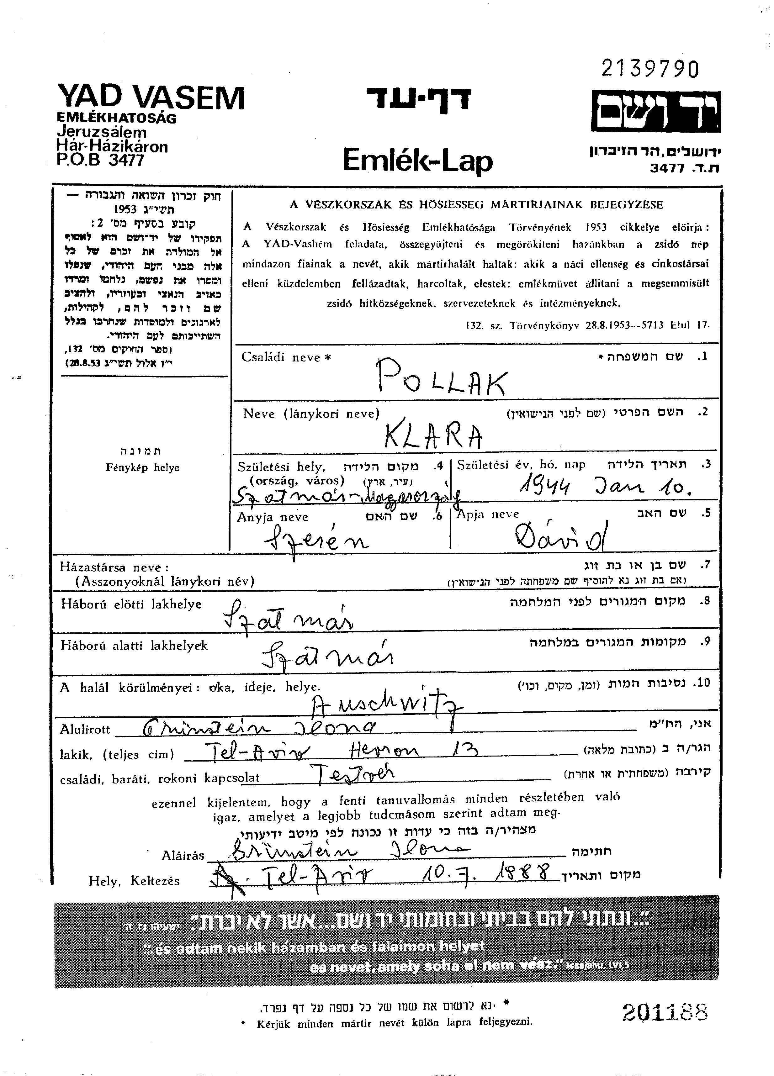 Pollak Klara 1944 Szatmar, Roumanie Feuille de témoignage