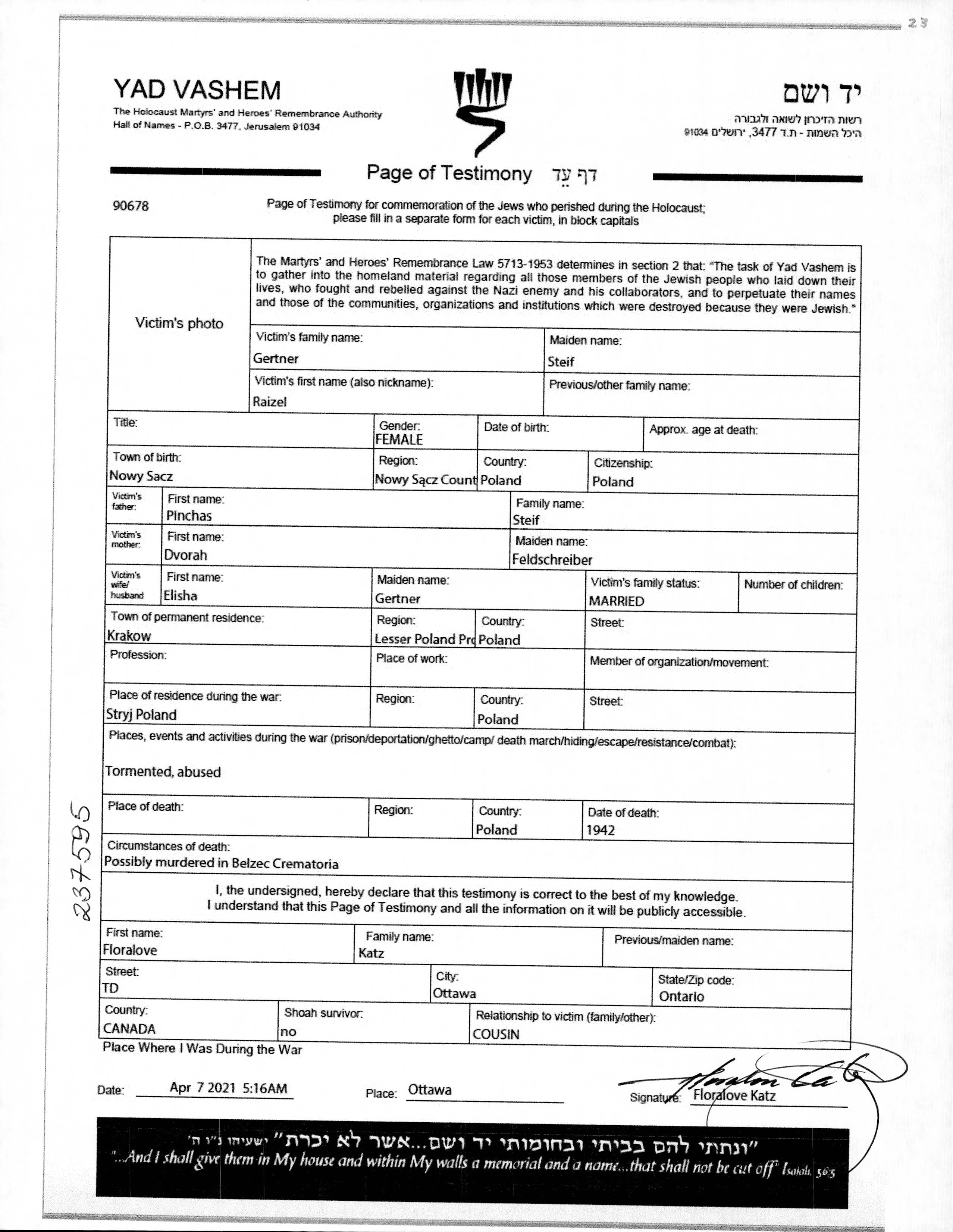 Raizel Gertner née Steif est née à Nowy Sącz, Pologne, fille de Pinchas et de Dvorah née Feldschreiber. Elle était Mariée à Elisha. Avant la seconde guerre mondiale elle vivait à Krakow, Pologne. Pendant la guerre, elle était à Stryj, Pologne.