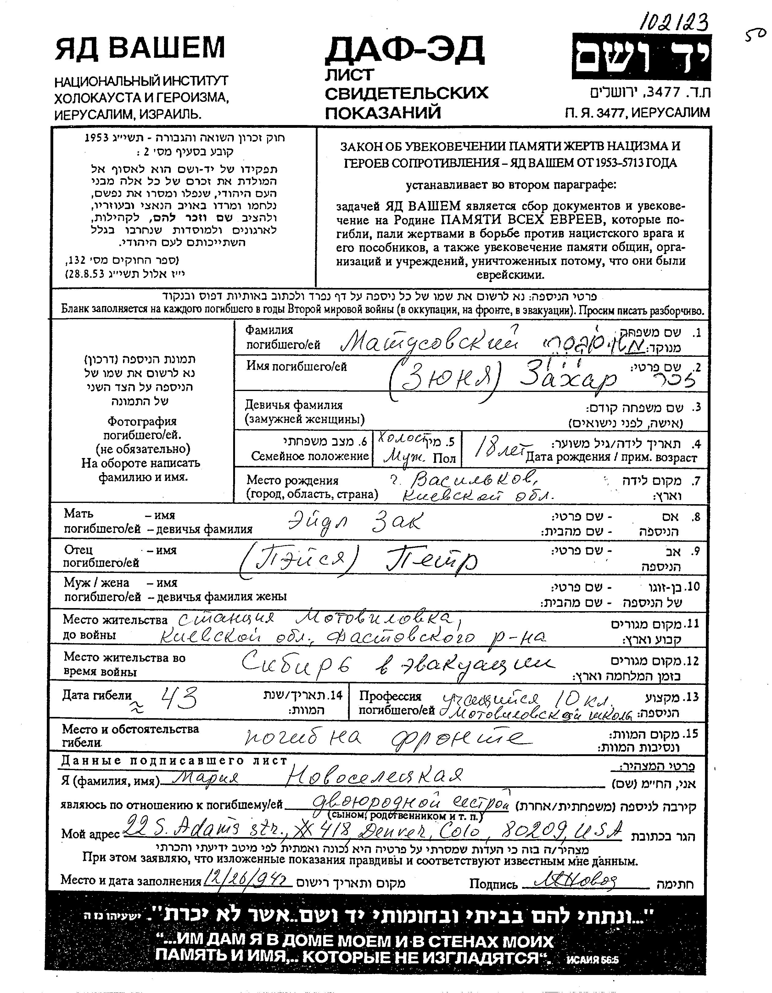 Matusovski Ziunia Zakhar 1925 Motovilovka, Ukraine (URSS) Feuille de témoignage