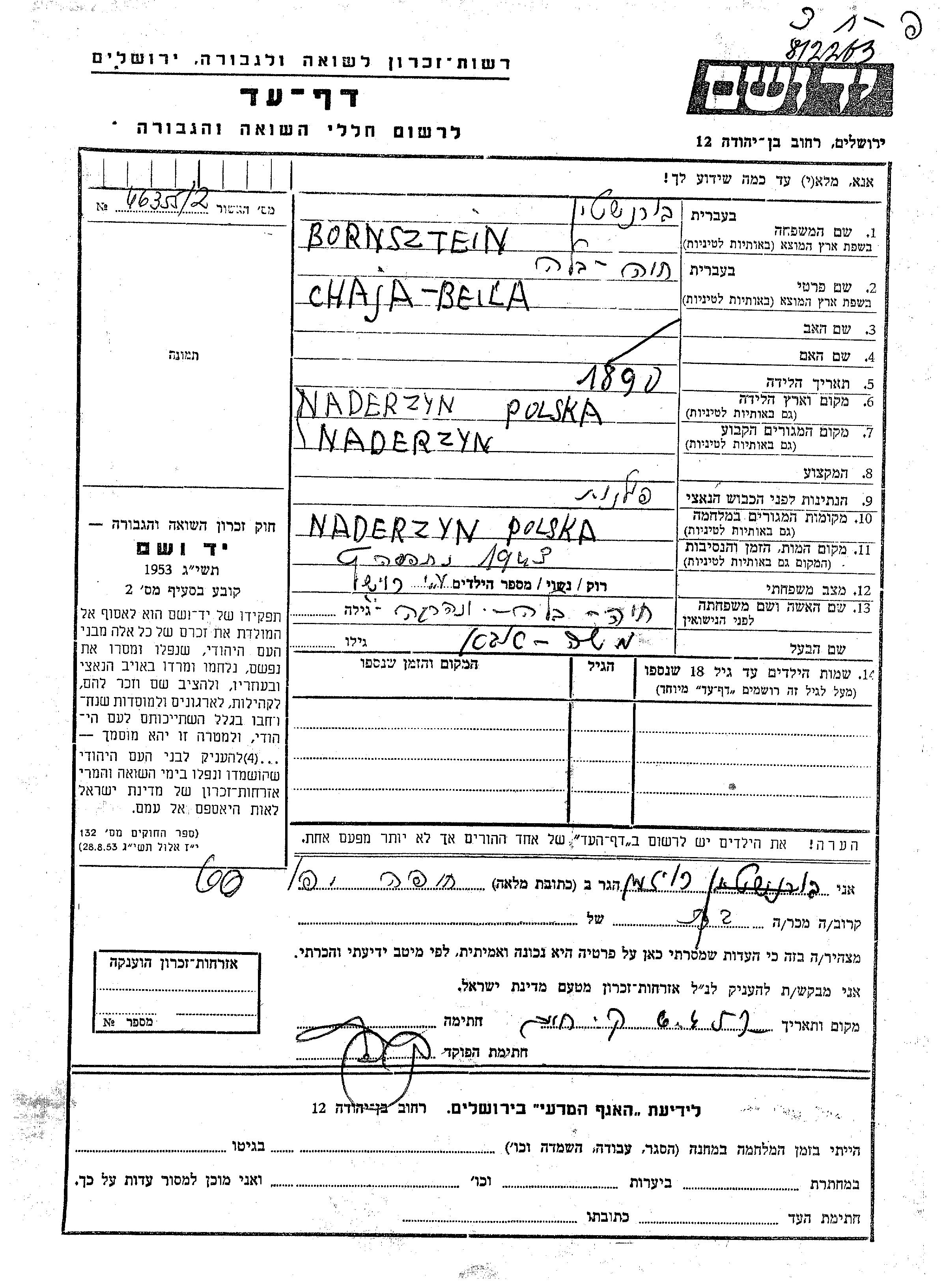Bornsztein Burshtin Chaja Beila 1890 Nadarzyn, Pologne Feuille de témoignage