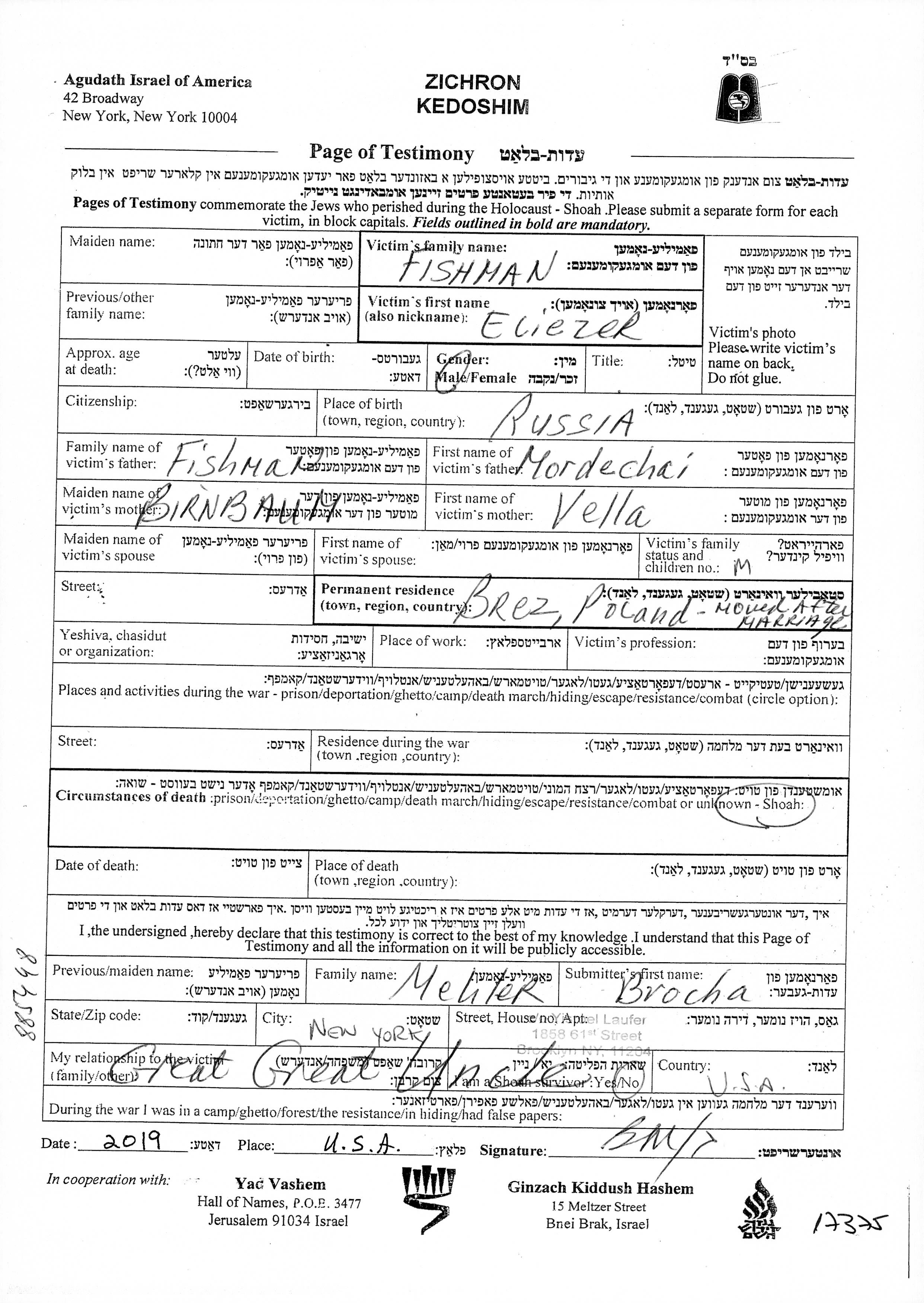 Fishman Eliezer Brest, Pologne Feuille de témoignage