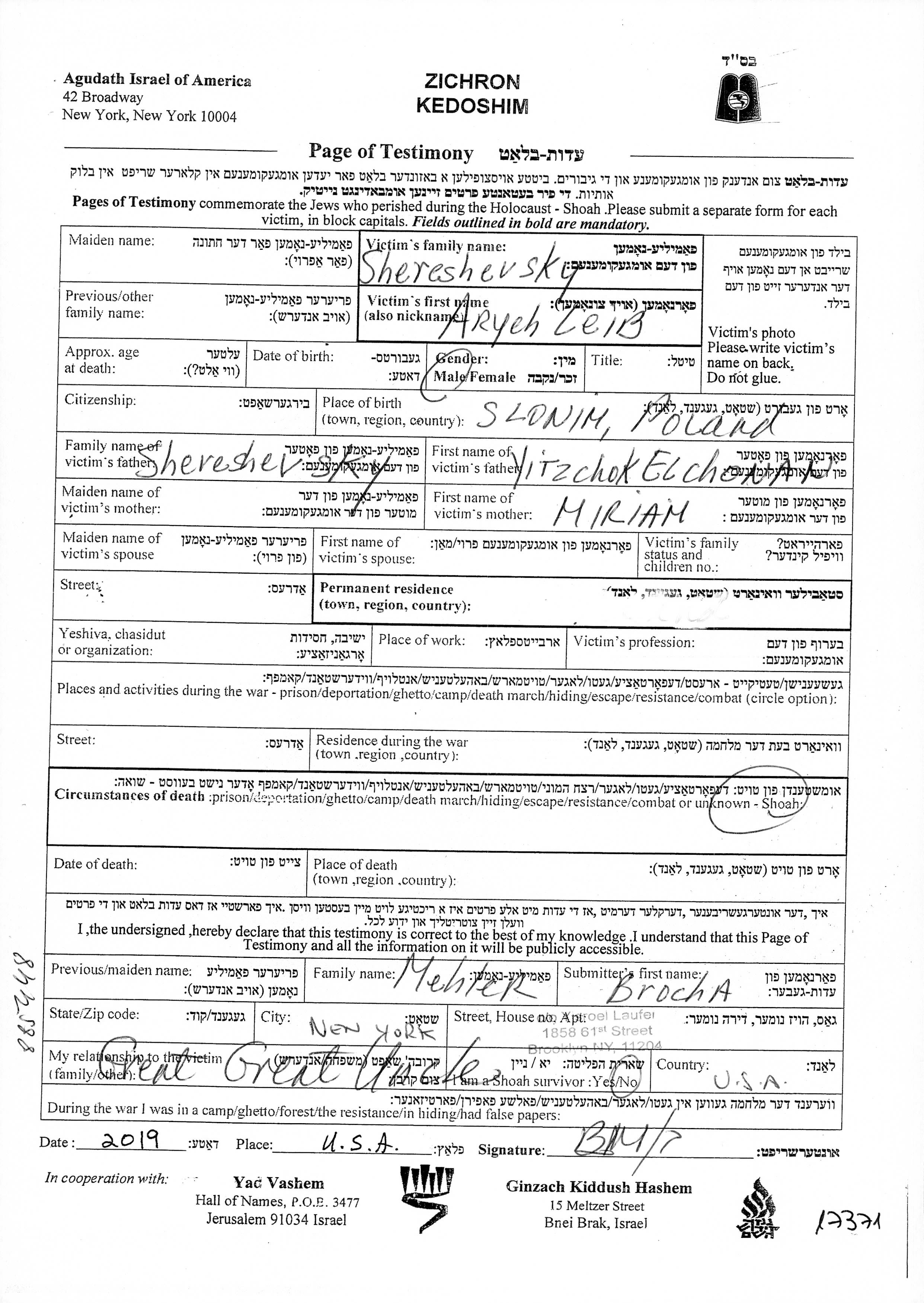 Shereshevsky Aryeh Leib endroit inconnu, Feuille de témoignage