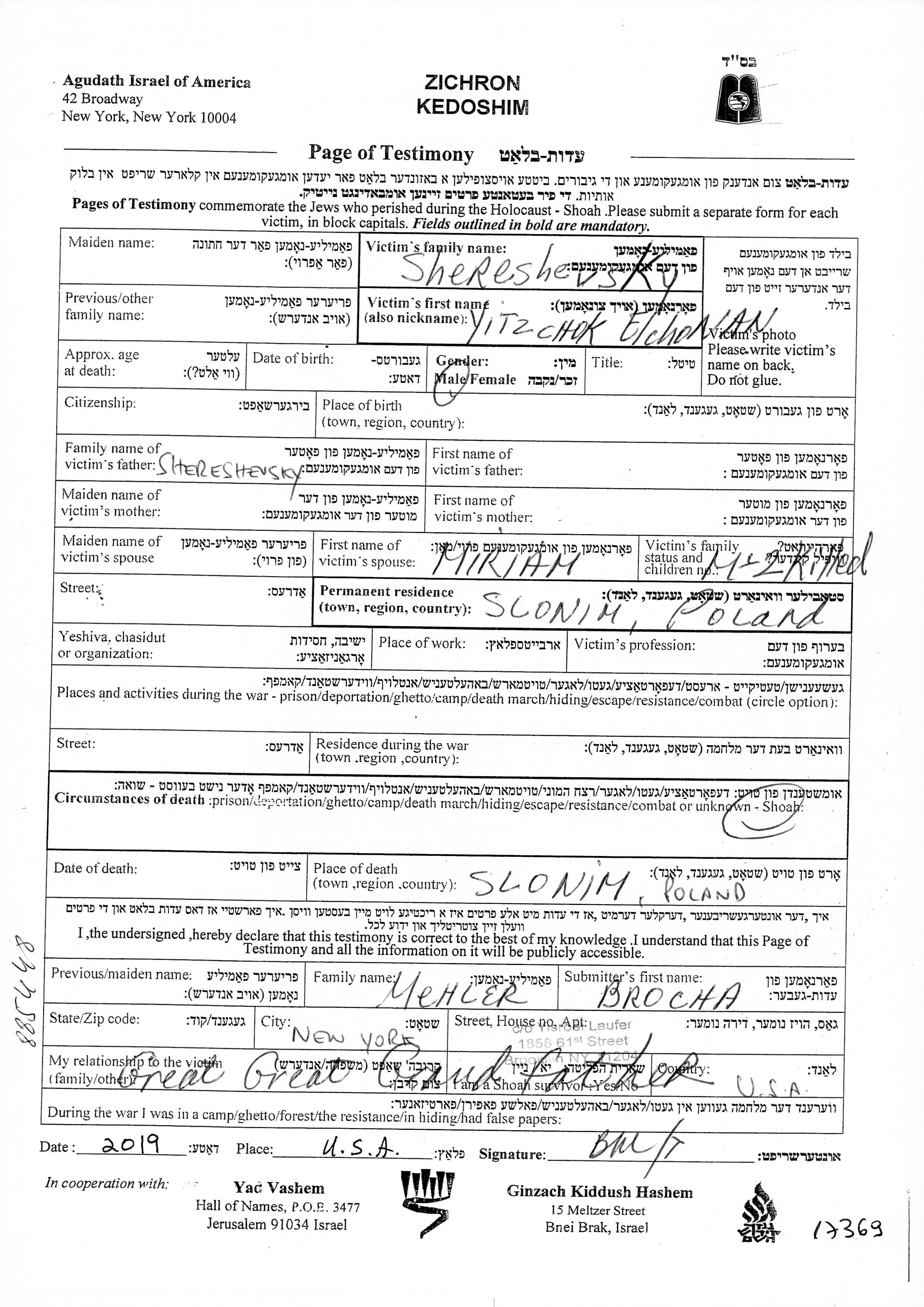 Shereshevsky Yitzchok Elchonan Slonim, Pologne Feuille de témoignage