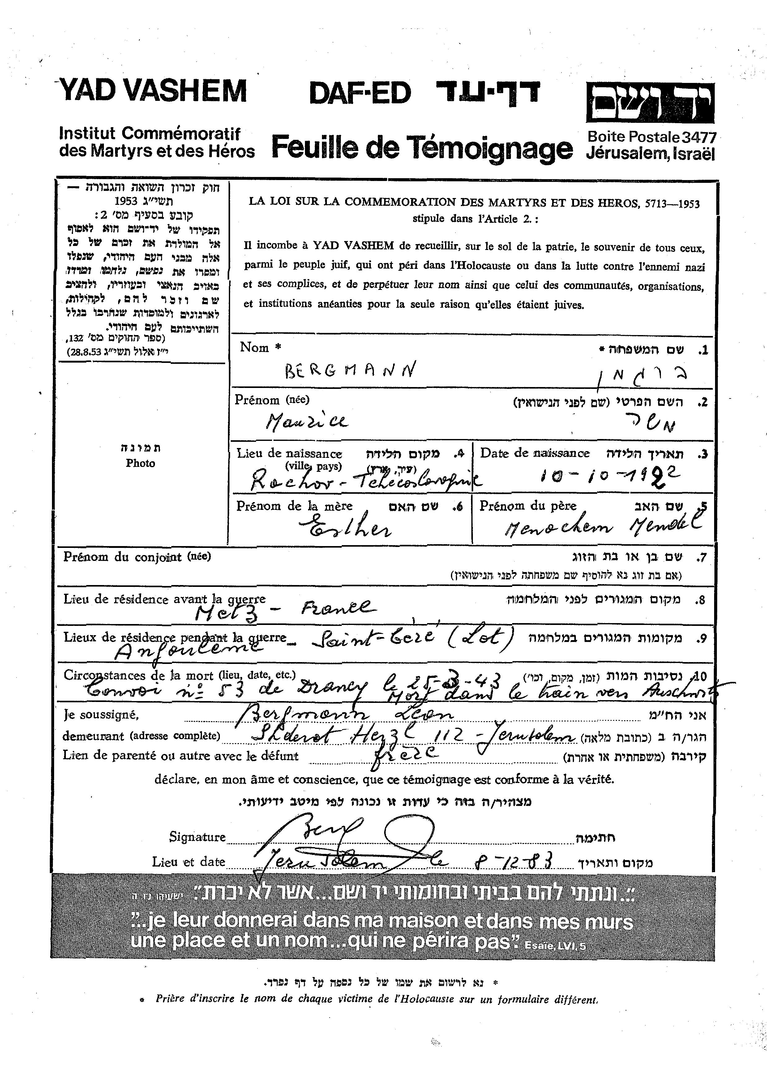 Bergman Maurice Moshe 1922 Metz, France Feuille de témoignage