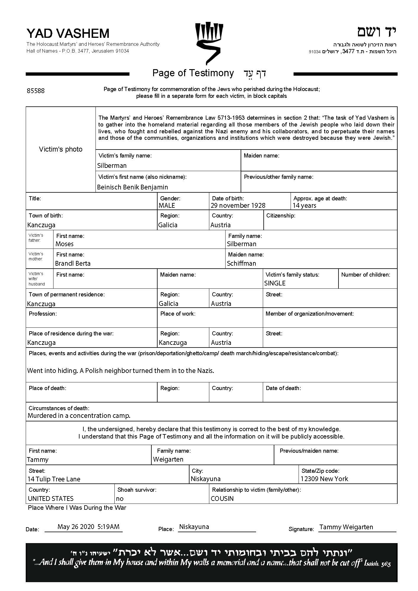 Beinisch Benik Silberman est né à Kanczuga, Pologne en 1928. Avant la seconde guerre mondiale il vivait à Kanczuga, Pologne.