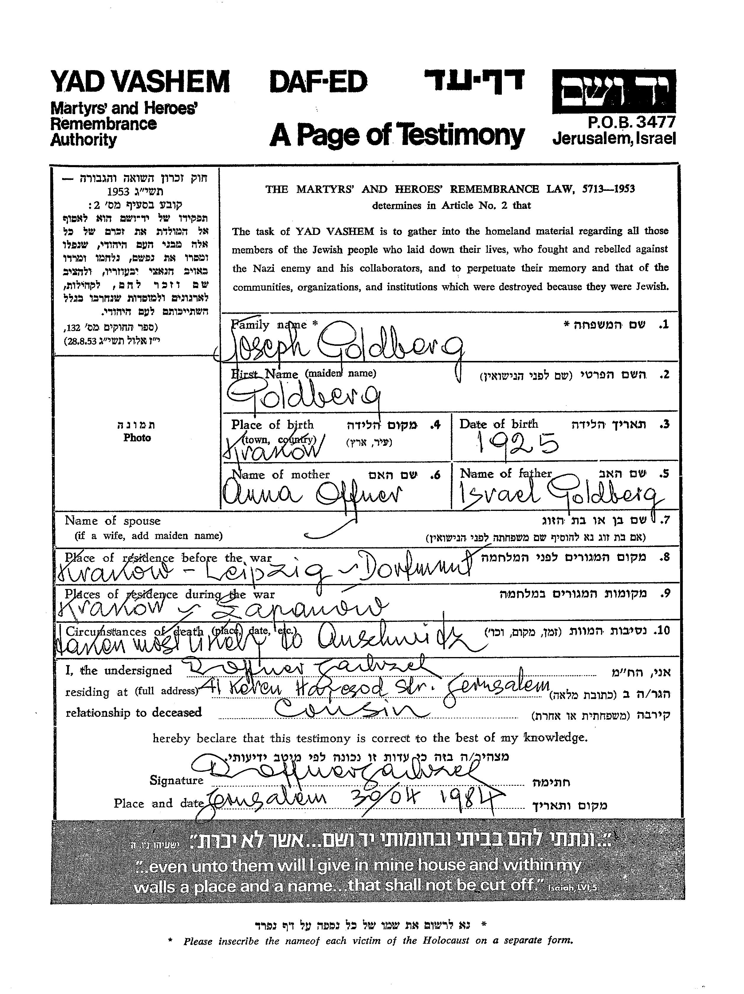 Goldberg Joseph 1925 Krakow, Pologne Feuille de témoignage
