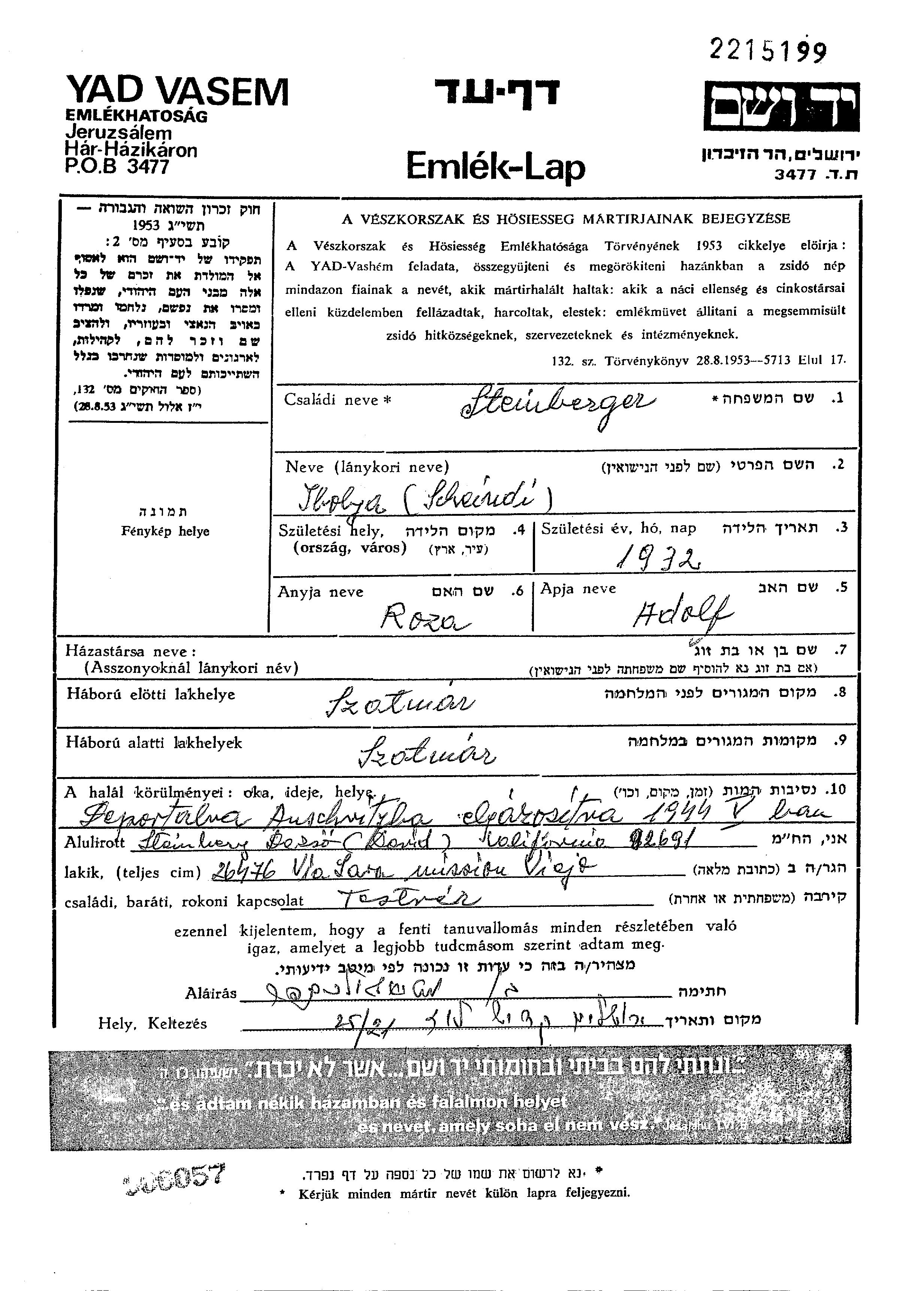 Steinberger Ibolya Scheindi 1932 Szatmar, Roumanie Feuille de témoignage