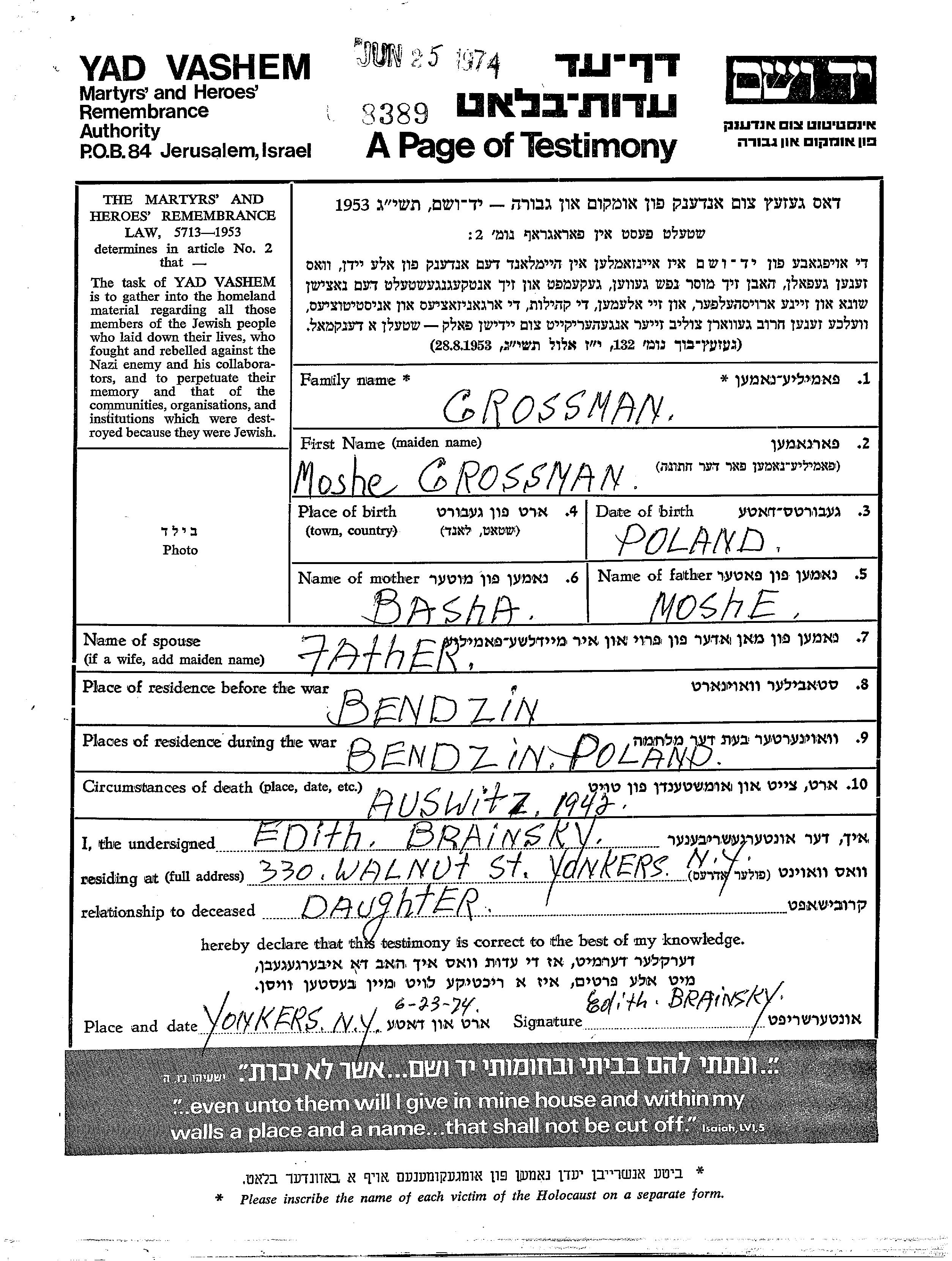 Grossman Moshe Bendzin, Pologne Feuille de témoignage