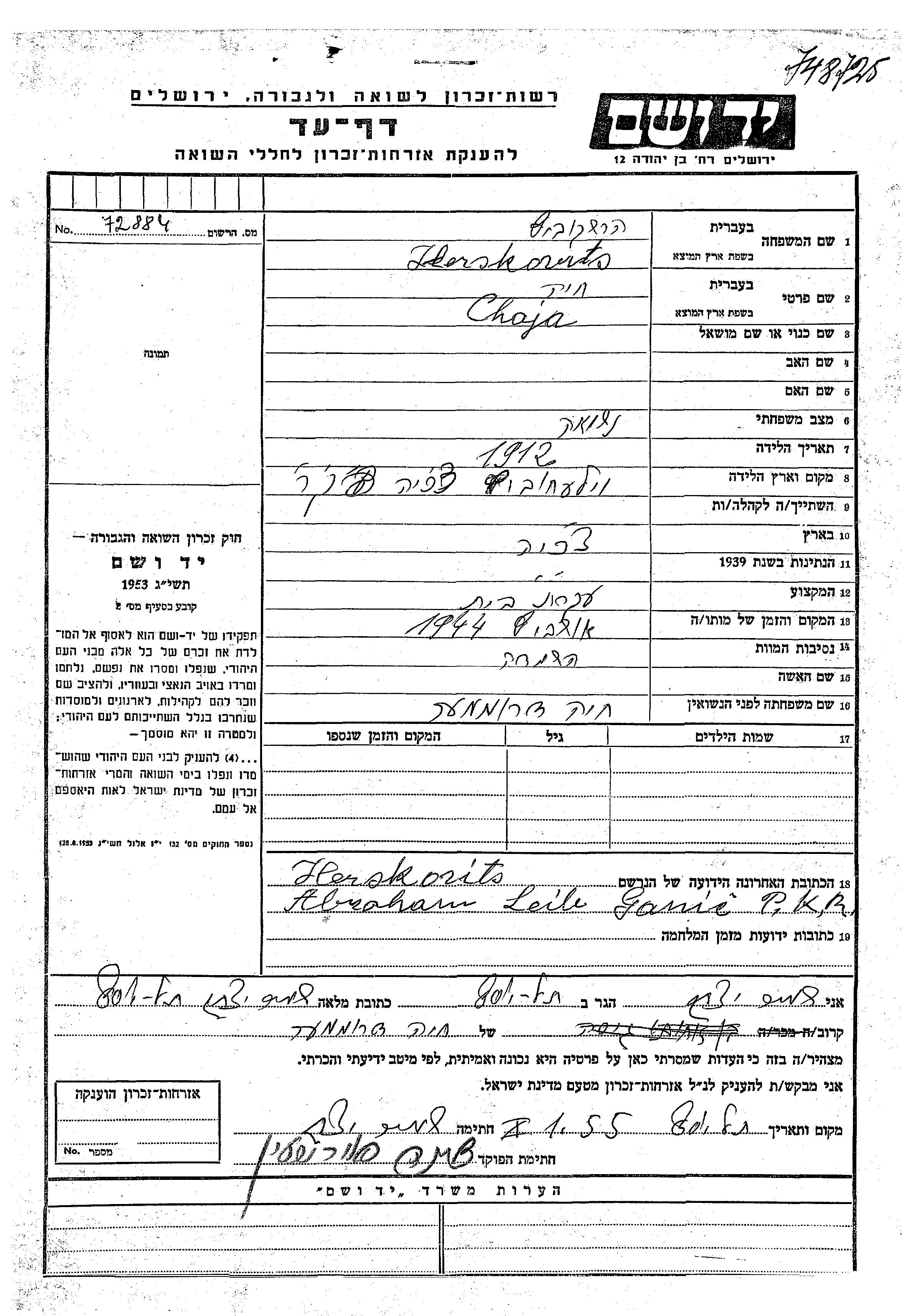Hershkowitz Chaja 1912 endroit inconnu, Feuille de témoignage