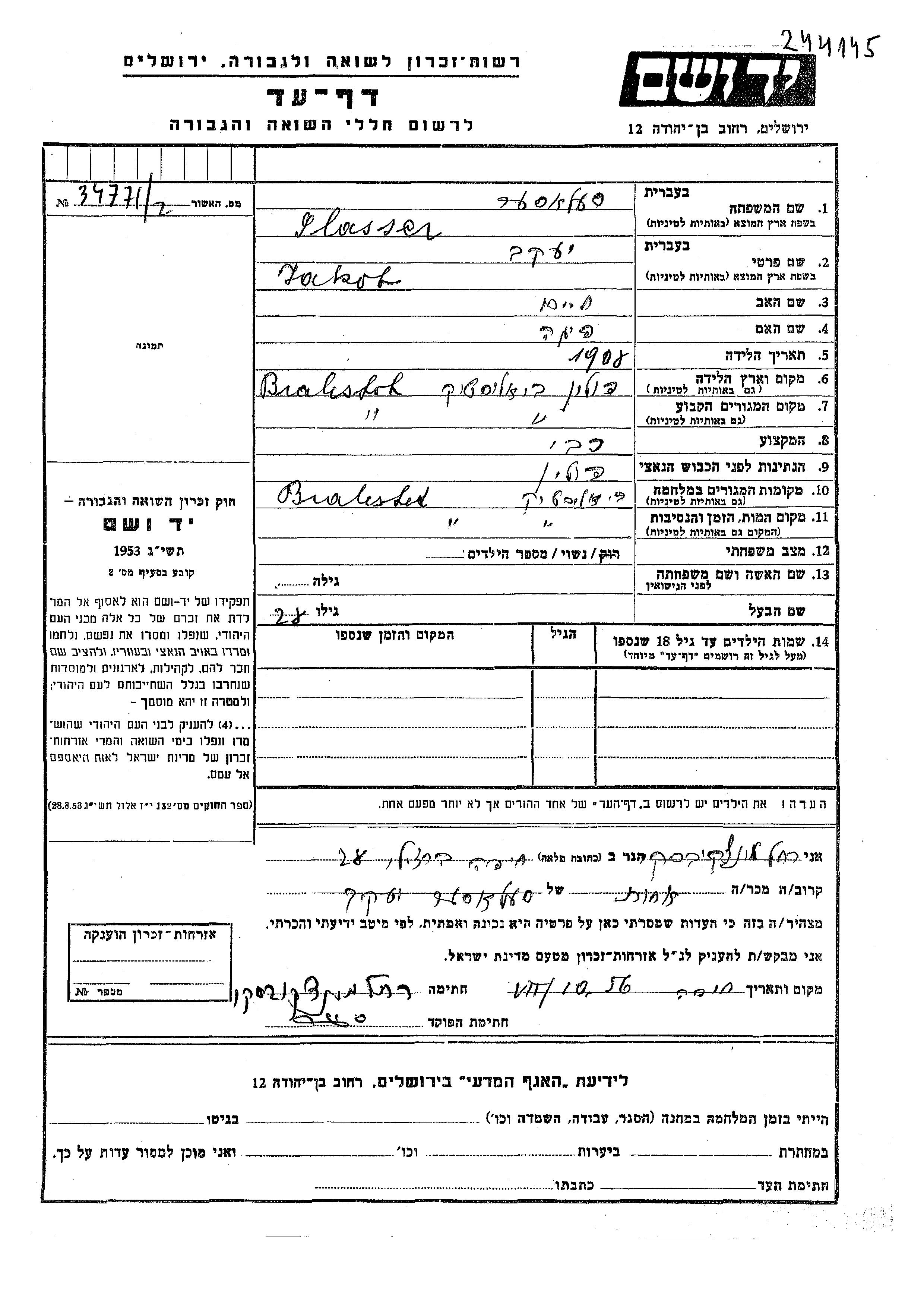 Slasser Slesar Jakob 1908 Bialistok, Pologne Feuille de témoignage