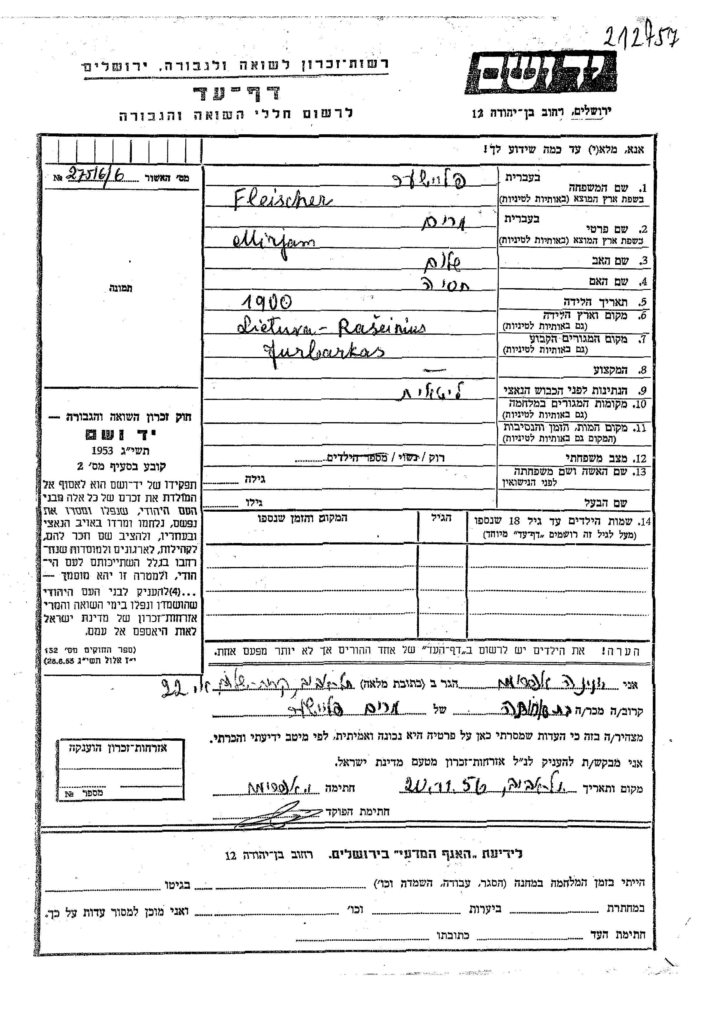 Fleischer Mirjam 1900 Yurbarkas, Lituanie Feuille de témoignage