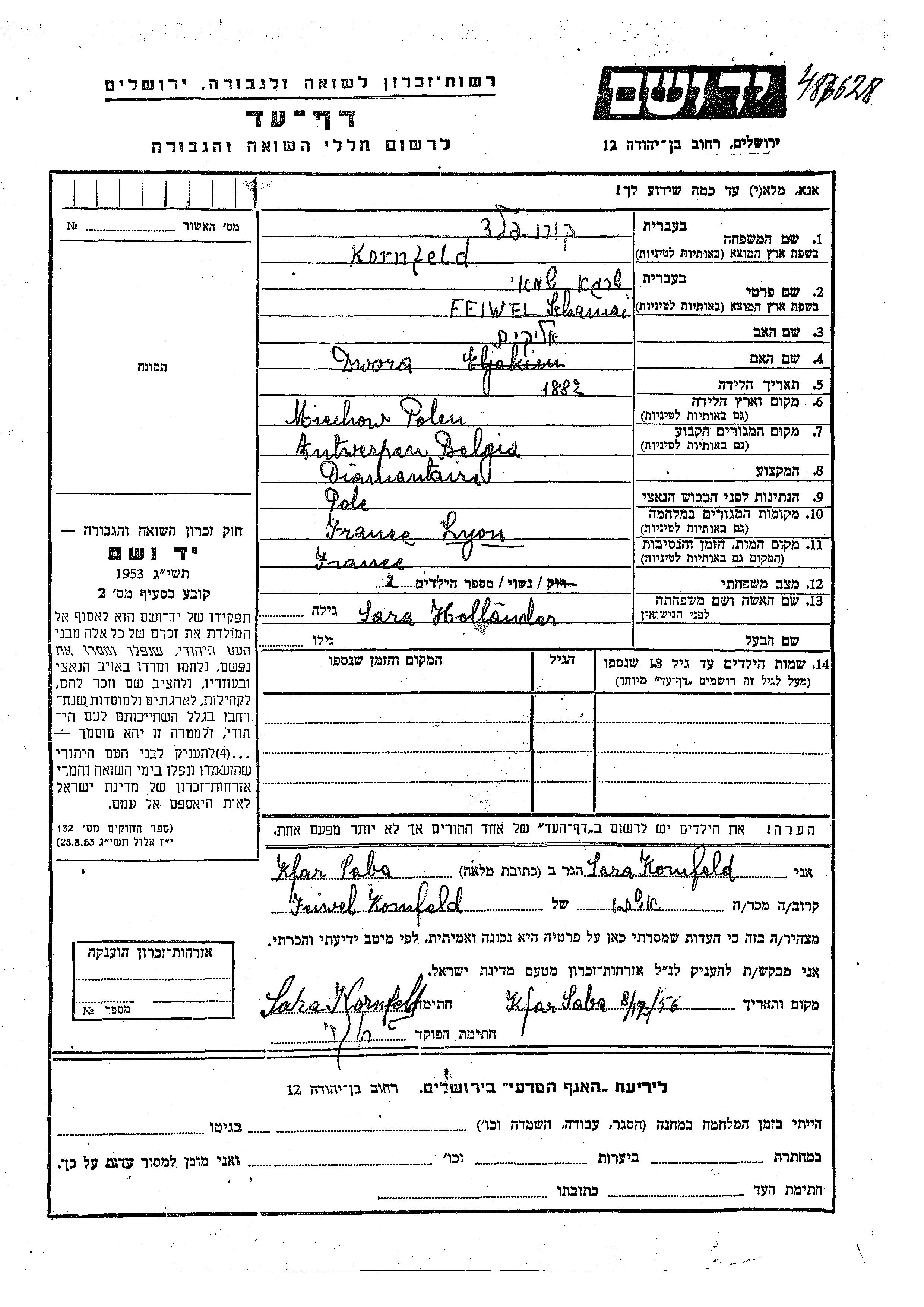 Feiwel Schamai Shraga Kornfeld est né à Miechów, Pologne en 1882, fils de Elyakim et de Dwora. Il était Mariée à Sara née Hollander. Avant la seconde guerre mondiale il vivait à Antwerpen, Belgique. Au cours de la guerre, il était à Lyon, France.