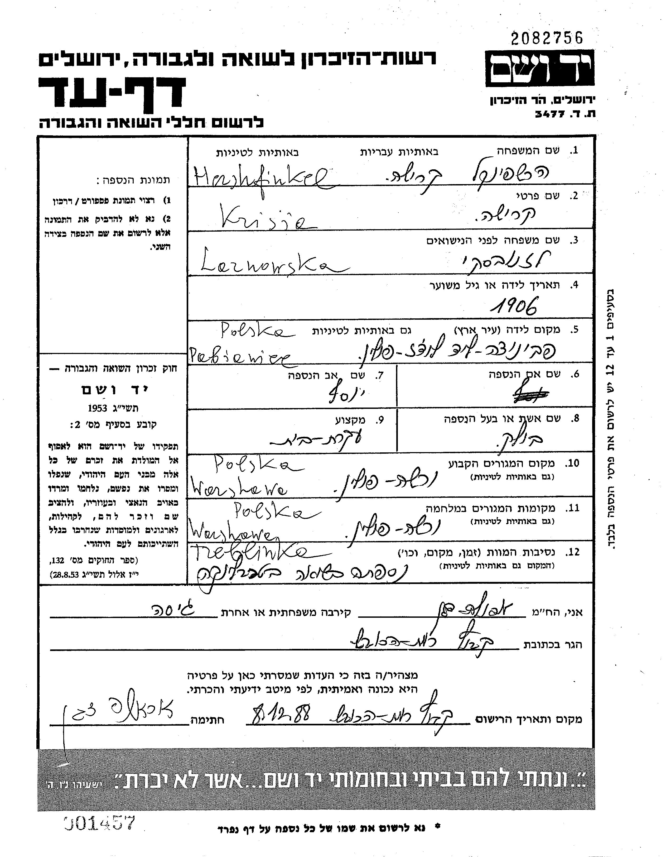 Hershfinkel | Krisza | 1906 | Warszawa, Pologne | Feuille de témoignage |
