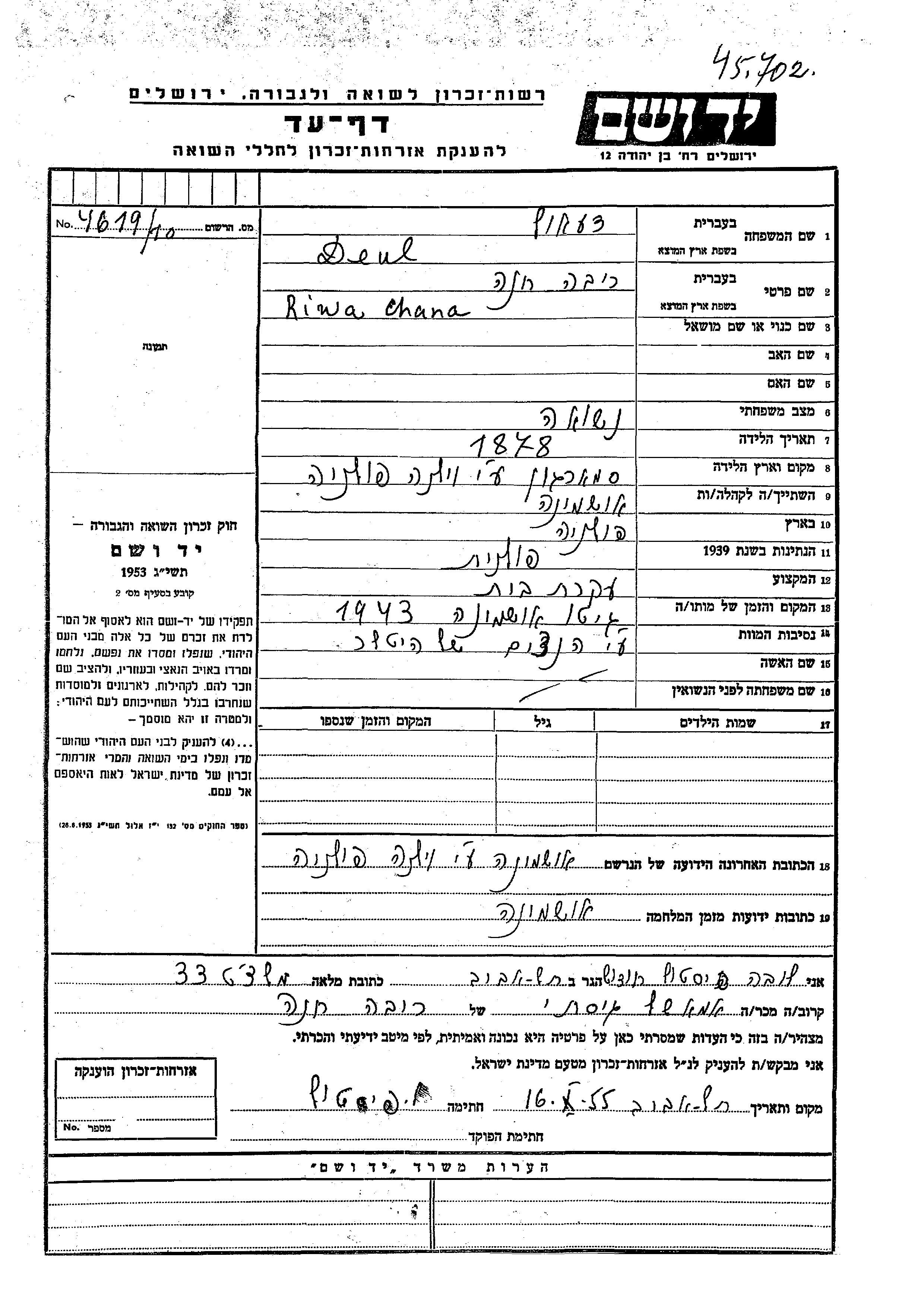 Riwa Chana Deul est née à Smargon, Pologne en 1878. Elle était Femme au foyer. Avant la seconde guerre mondiale elle vivait à Oszmiana, Pologne. Pendant la guerre, elle était à Oszmiana, Pologne.