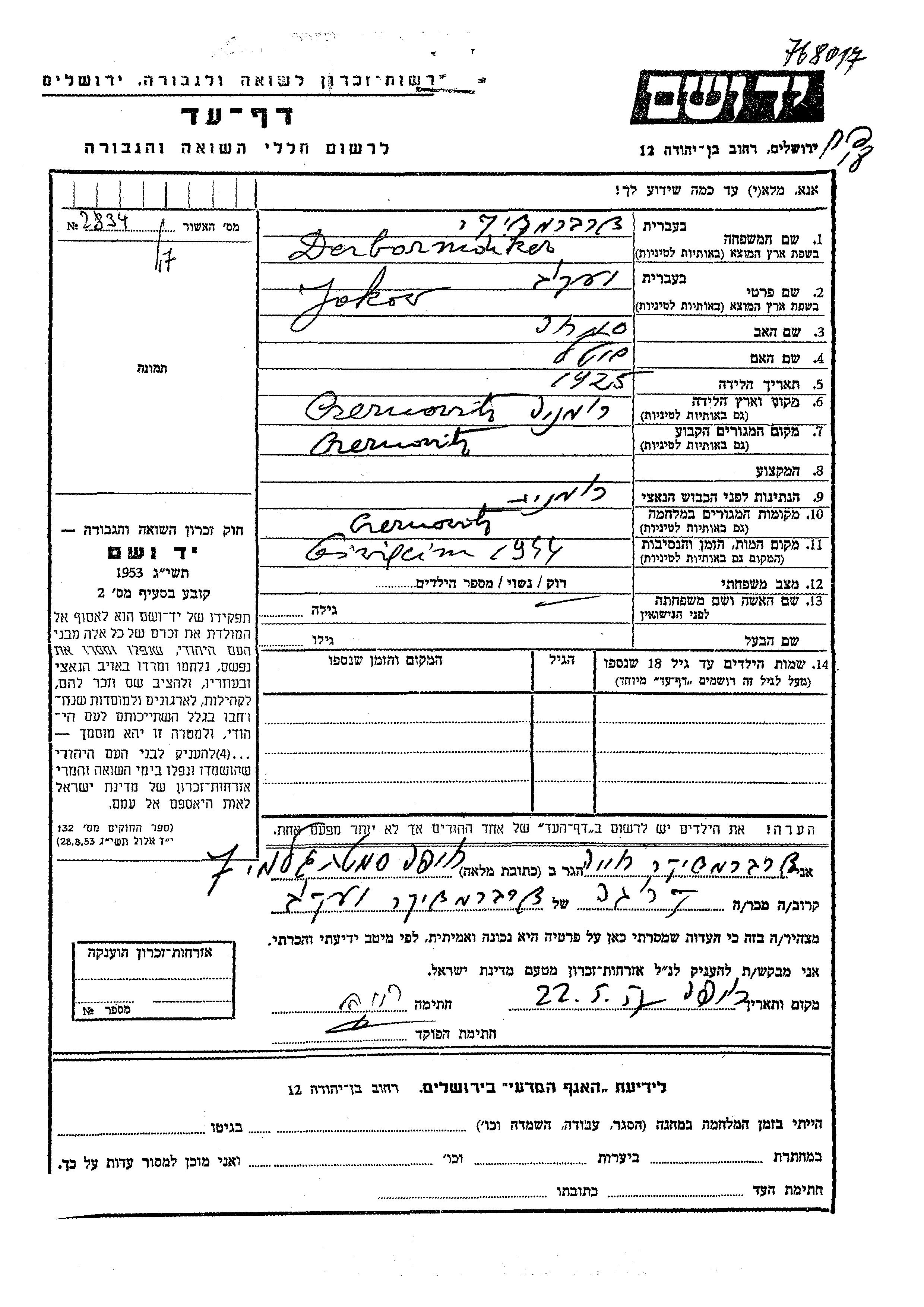 Derbaremdiker Jakov 1925 Cernauti, Roumanie Feuille de témoignage