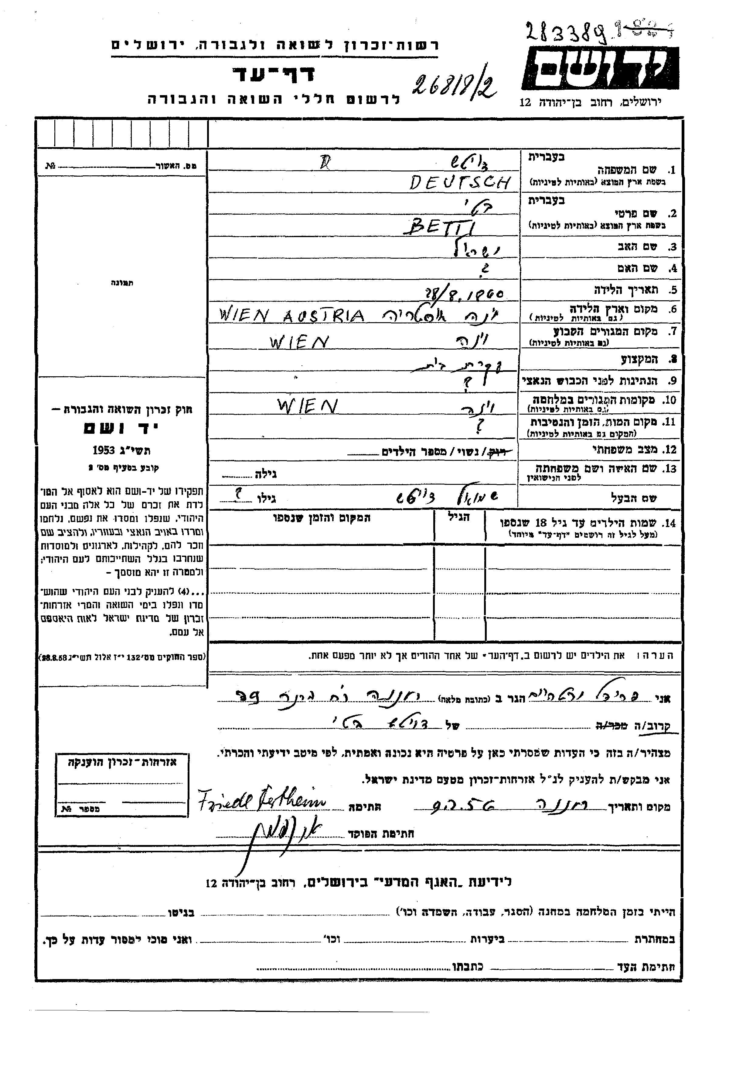 Betti Deutsch est née à Wien, Autriche en 1860, fille de Yisrael. Elle était Femme au foyer et Mariée à Shmuel. Avant la seconde guerre mondiale elle vivait à Wien, Autriche. Pendant la guerre, elle était à Wien, Autriche.