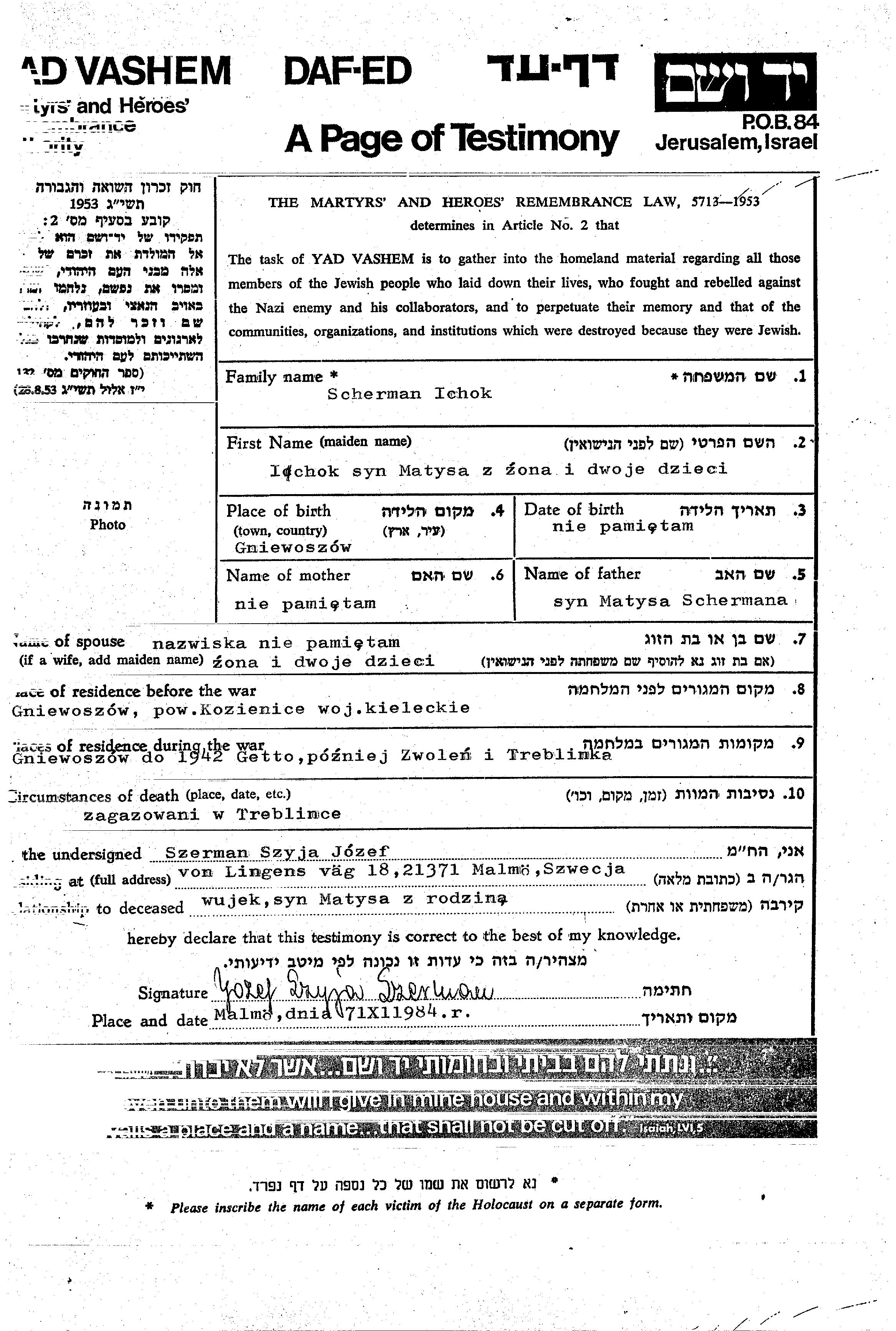 Scherman Ichok Gniewoszow, Pologne Feuille de témoignage