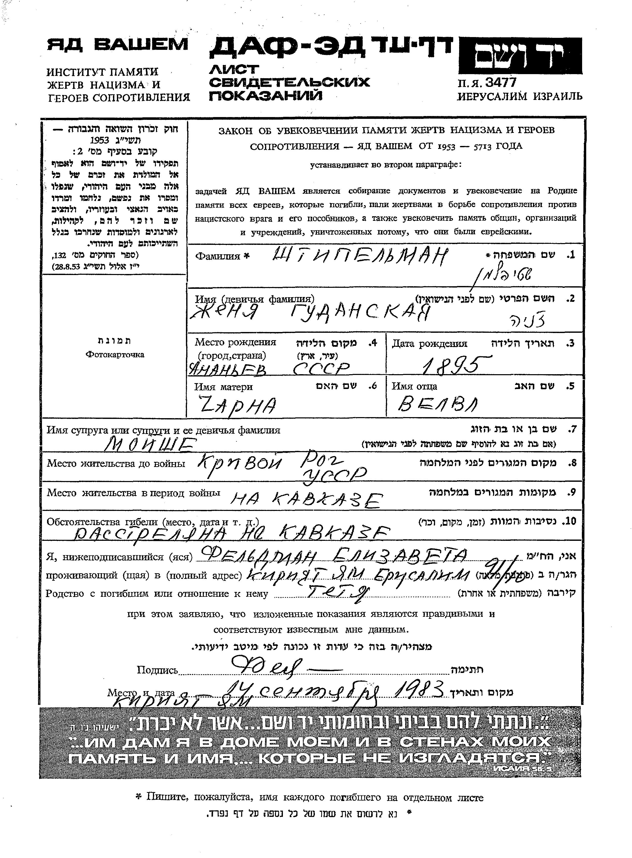 Shtipelman Zhenia 1895 Krivoy Rog, Ukraine (URSS) Feuille de témoignage