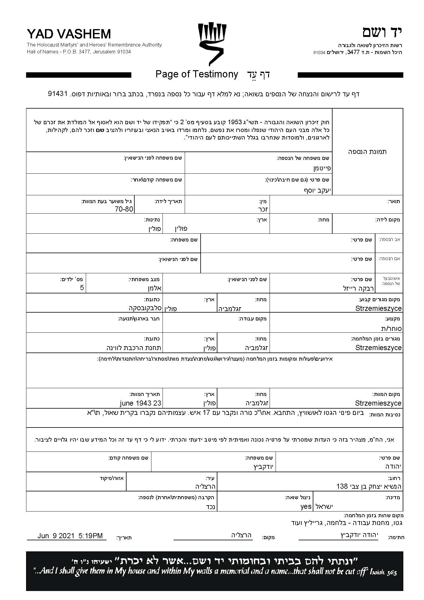 Feitman Yaakov Yosef Strzemieszyce, Pologne Feuille de témoignage (digitale)