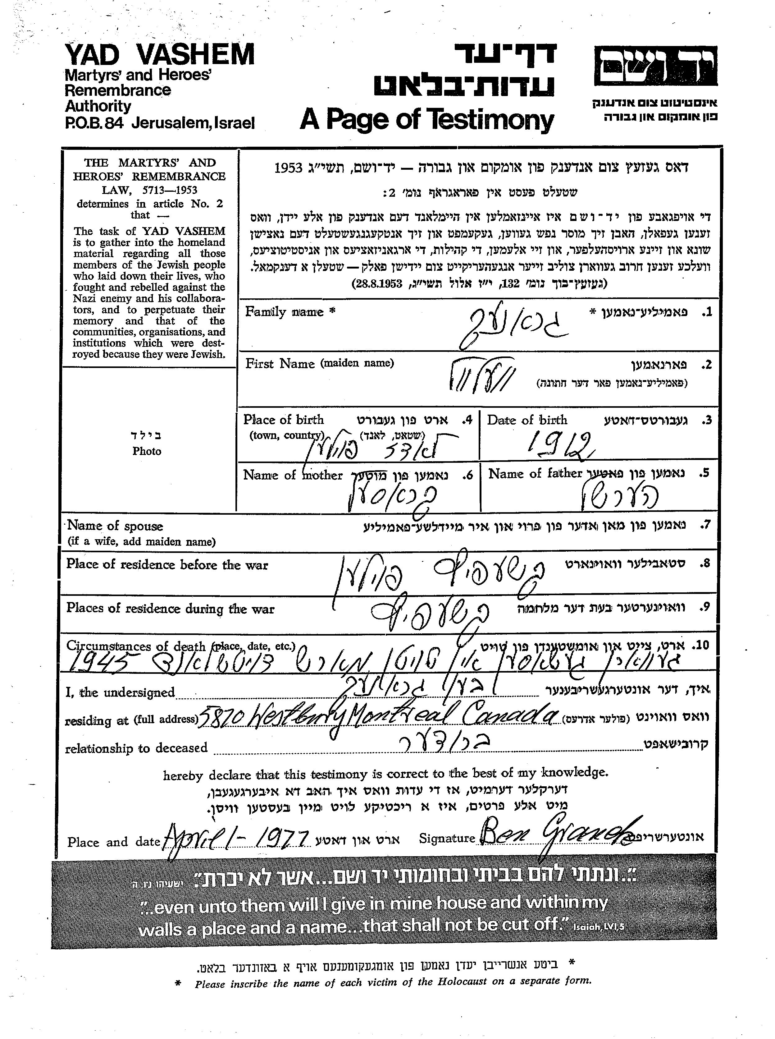 Yad Vashem - Pages of Testimony Names Memorial Collection