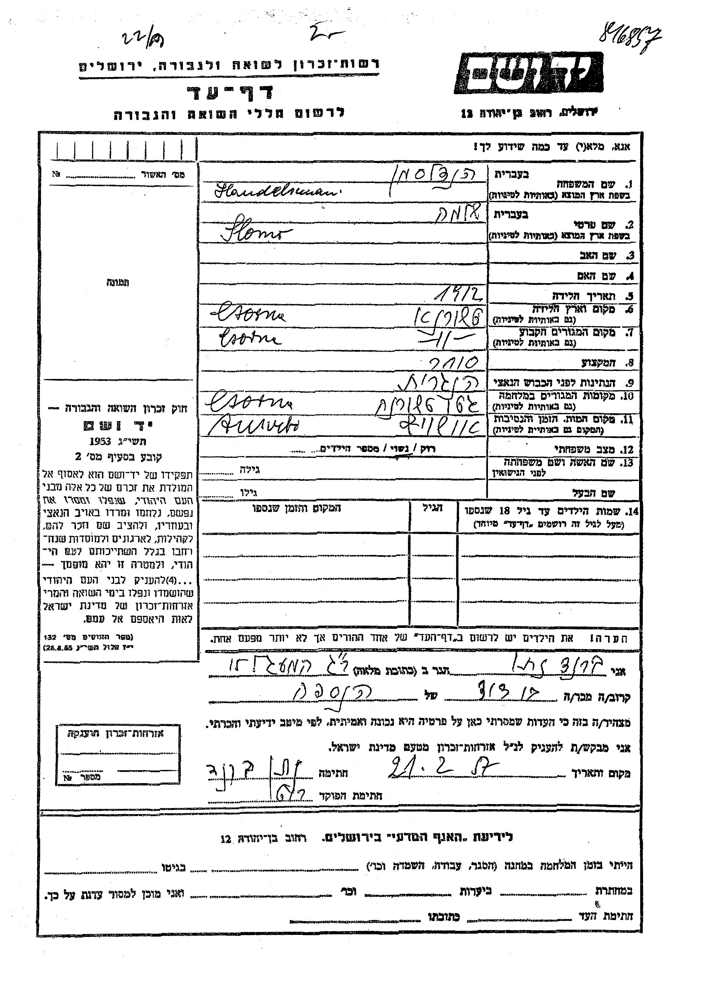 Slome Handelsman est né à Csorna, Hongrie en 1912. Il était Commerçant/e et Marié. Avant la seconde guerre mondiale il vivait à Csorna, Hongrie. Au cours de la guerre, il était à Csorna, Hongrie.
