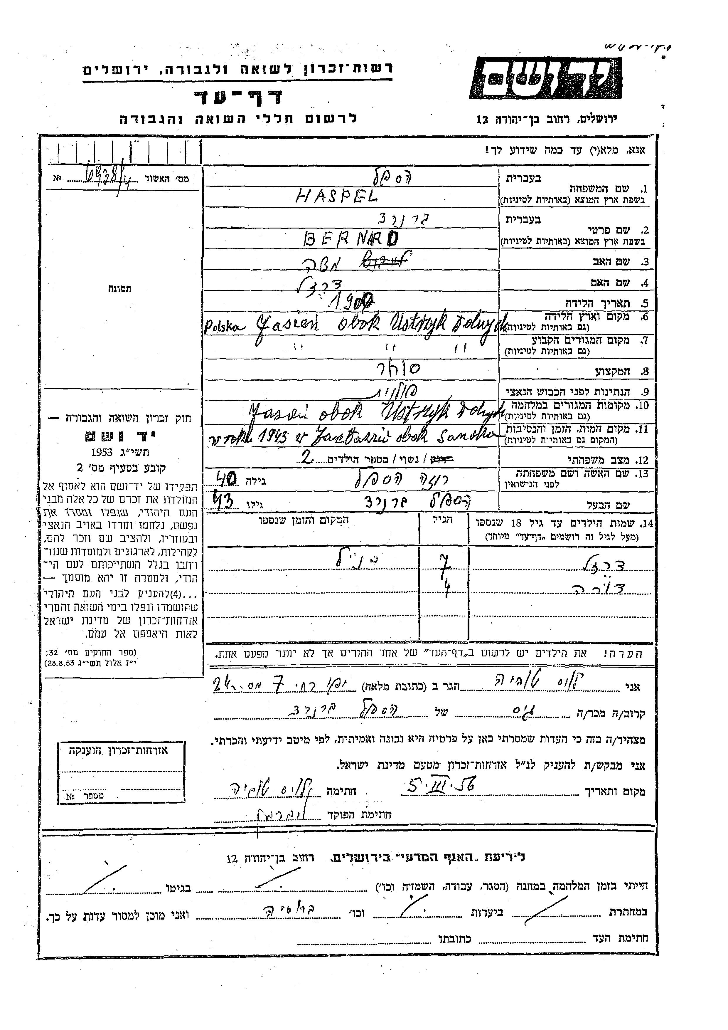 Yad Vashem - Pages of Testimony Names Memorial Collection