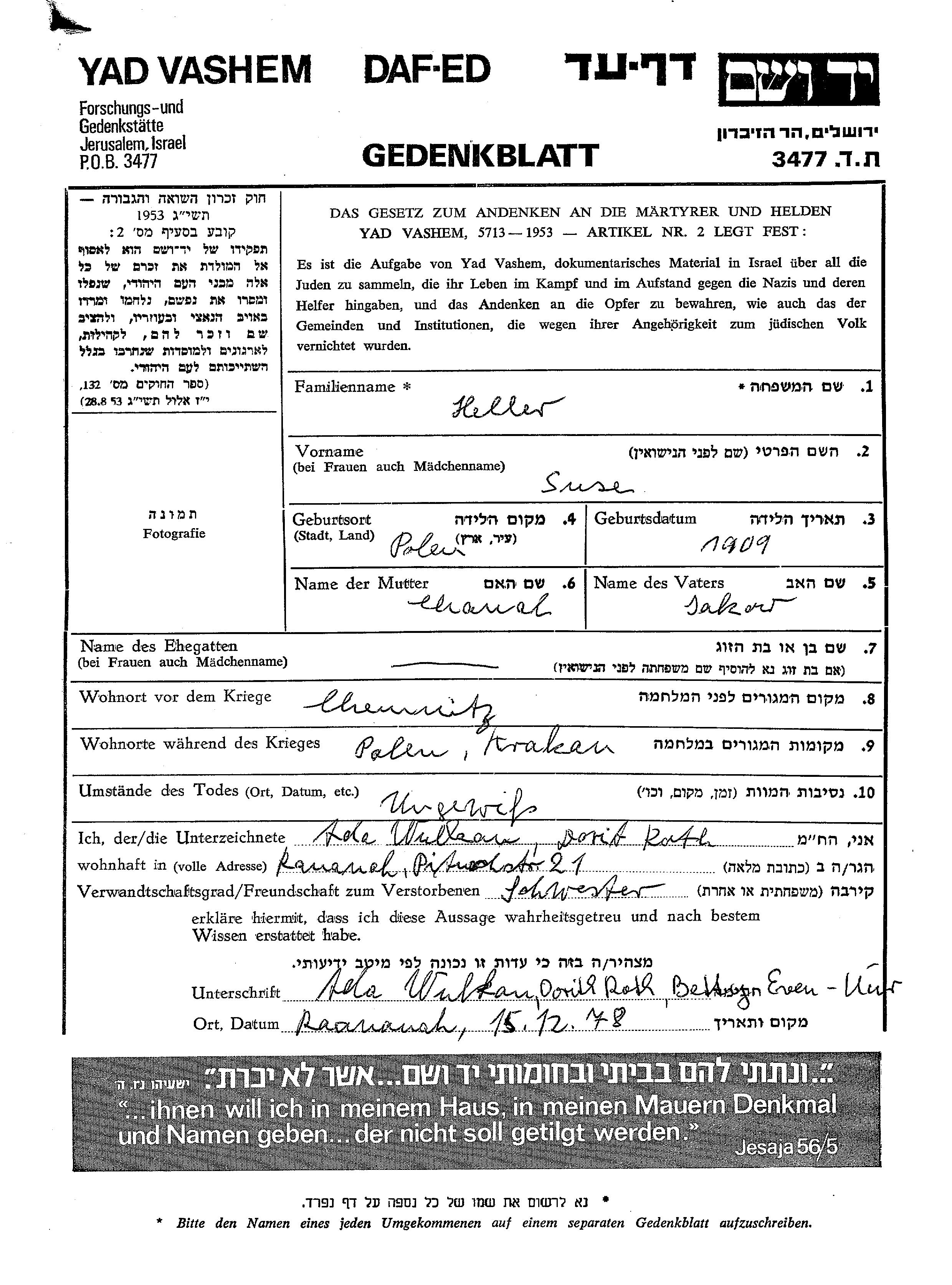 Suse Heller est née à Pologne en 1909, fille de Jakow et de Chavah. Avant la seconde guerre mondiale elle vivait à Chemnitz, Allemagne. Pendant la guerre, elle était à Krakow, Pologne.