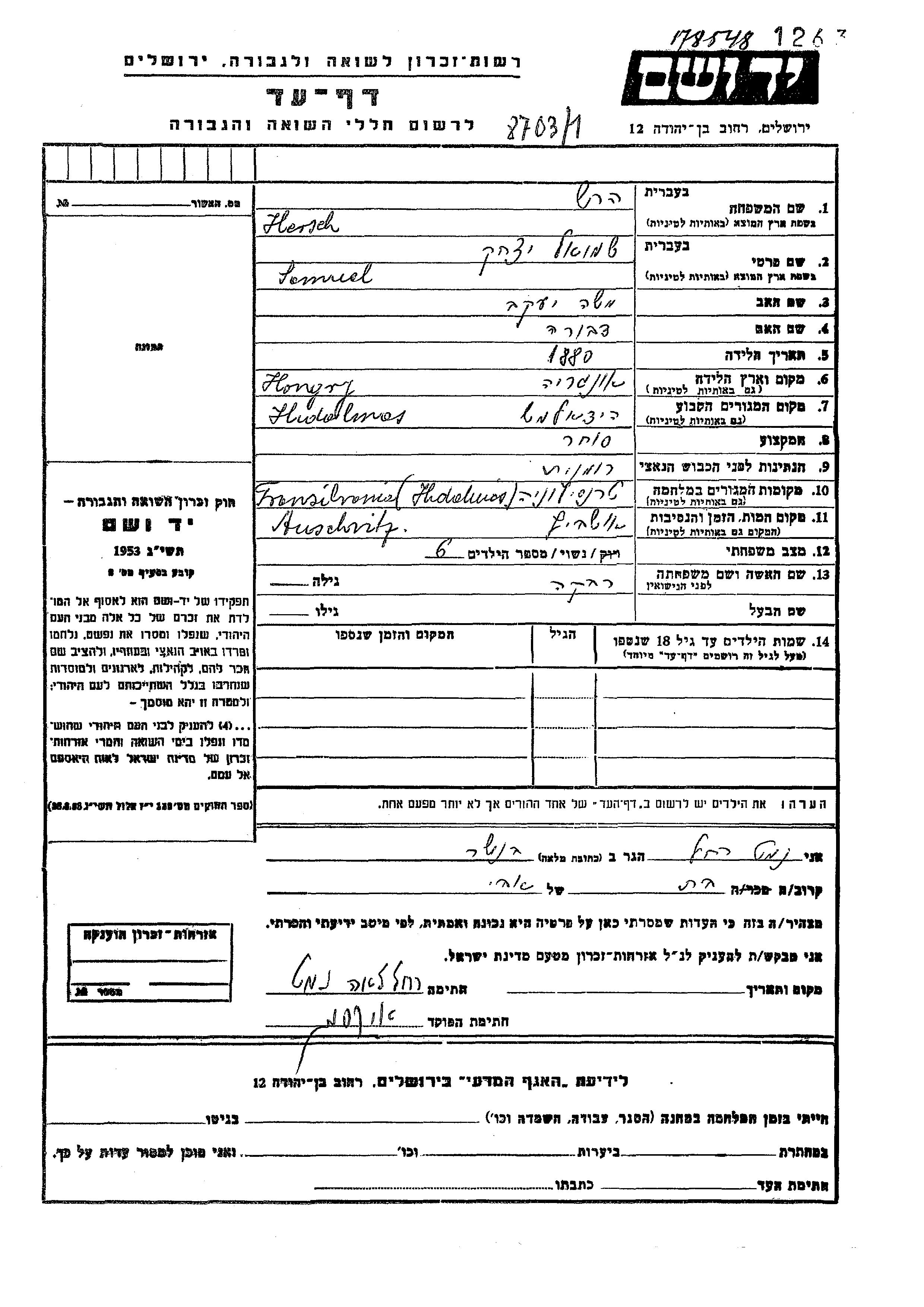 Smuel Yitzkhak Hersch est né à Hongrie en 1880, fils de Moshe Yaakov et de Dvora. Il était Commerçant/e et Mariée à Rivka. Avant la seconde guerre mondiale il vivait à Hidalmas, Roumanie. Au cours de la guerre, il était à Transylvania, Roumanie.