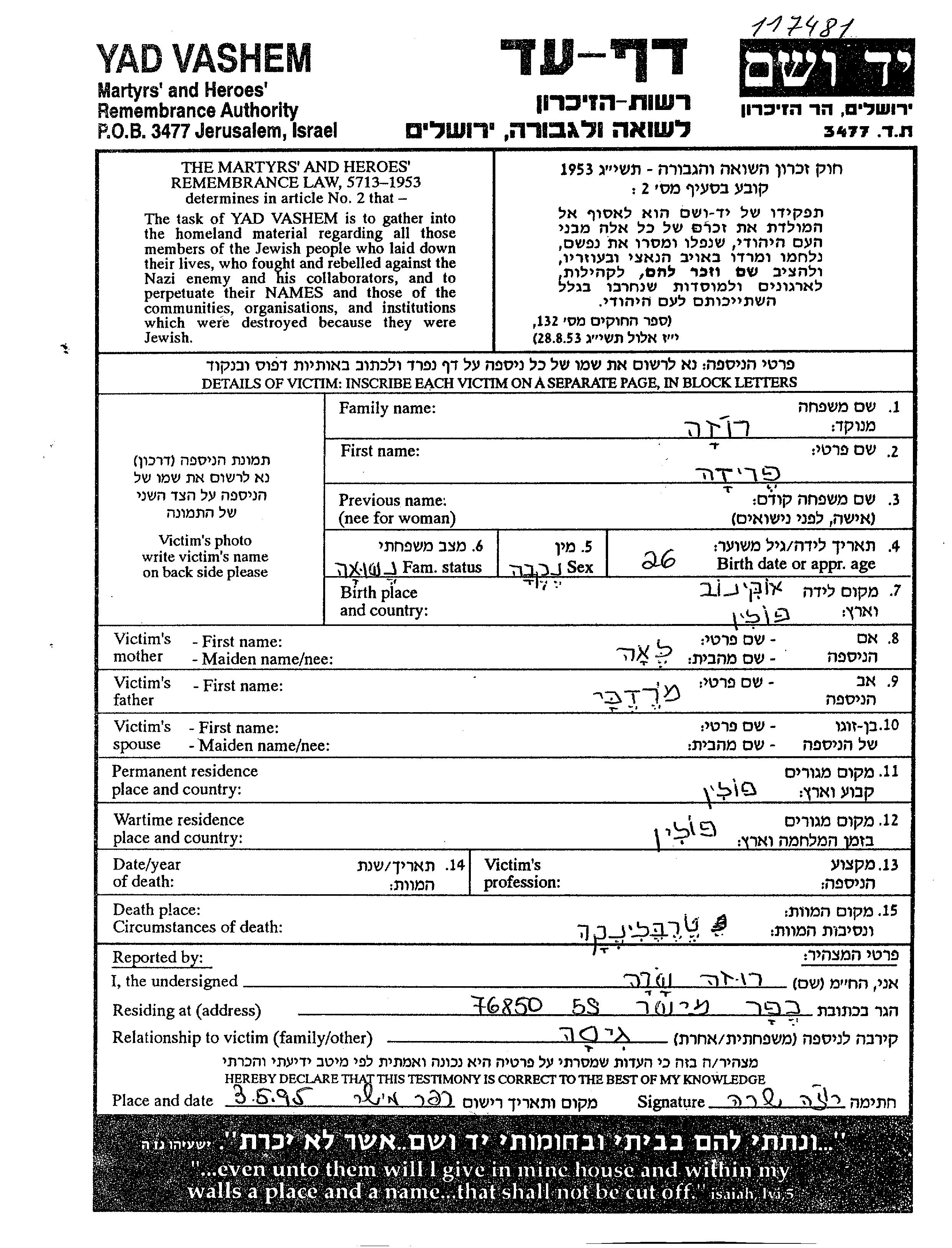 Yad Vashem - Pages of Testimony Names Memorial Collection
