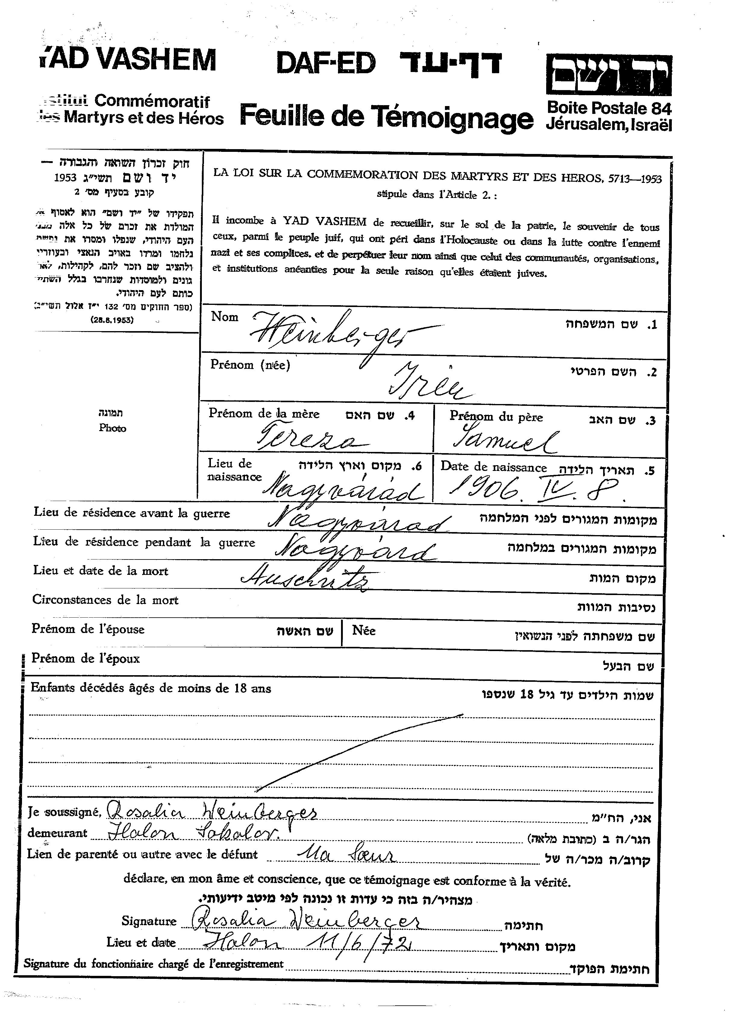 Weinberger Iren 1906 Nagyvarad, Roumanie Feuille de témoignage