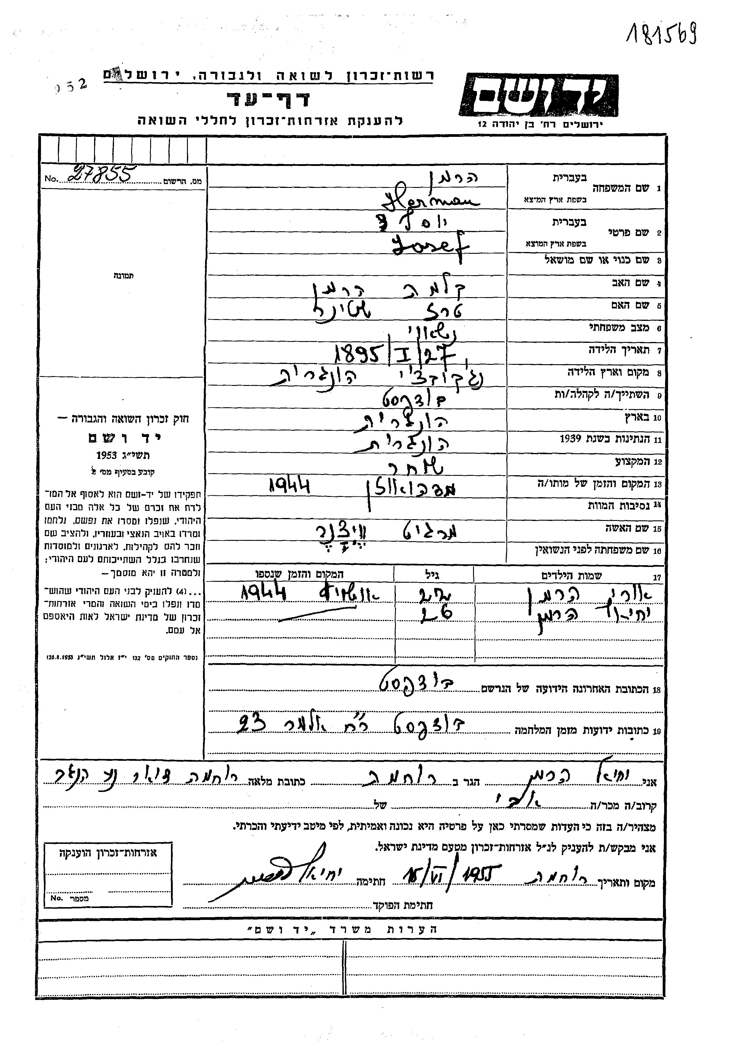 Herman Josef 1895 Budapest, Hongrie Feuille de témoignage