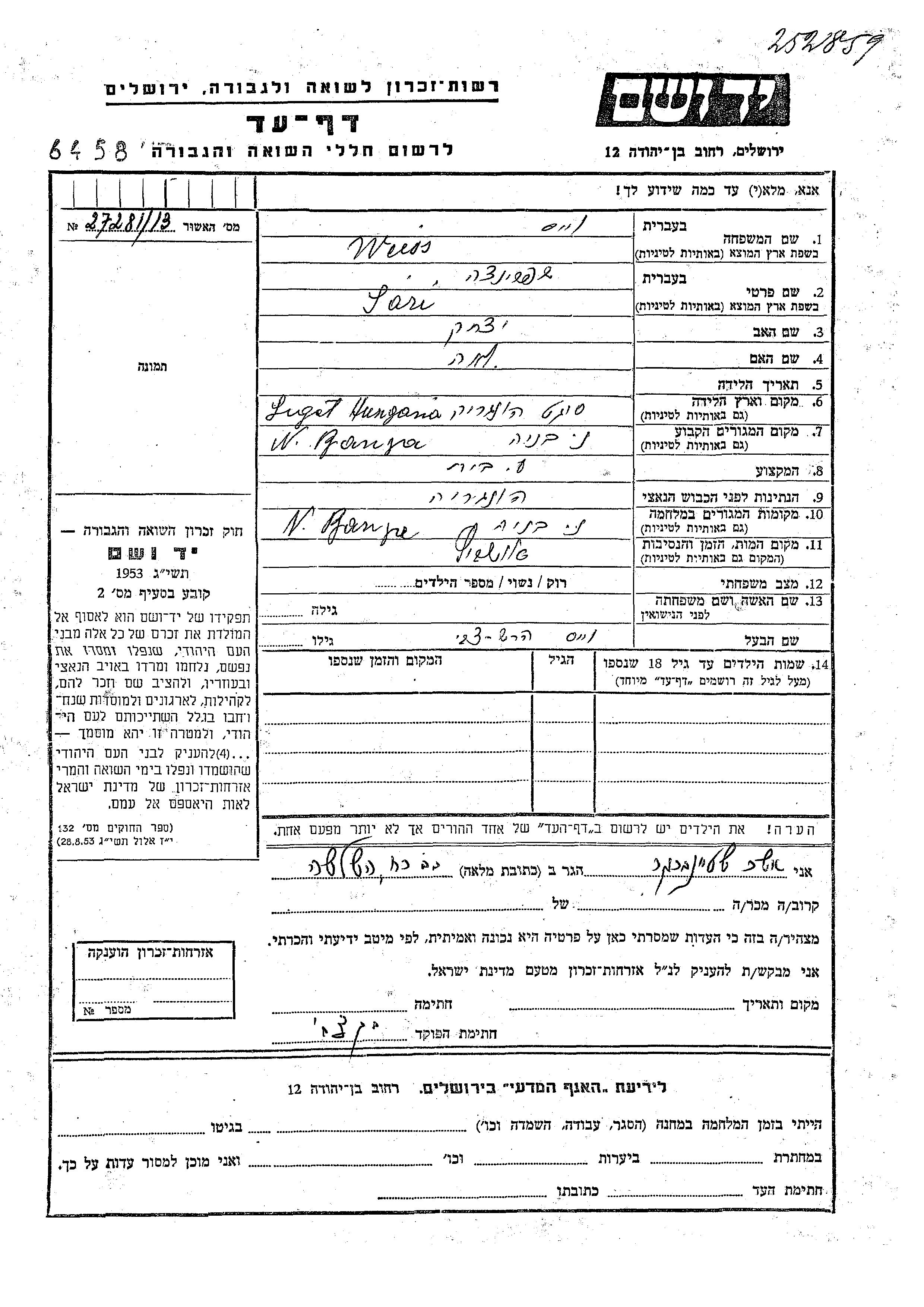 Yad Vashem - Pages of Testimony Names Memorial Collection